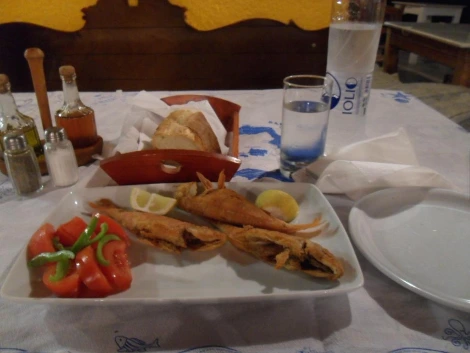 따뜻한 빵과 신선한 생선 튀김, 그 위에 살짝 레몬즙을 뿌려 먹으니 그야말로 진정한 지중해 요리였다. 한국에서 자주 먹던 조기와 굴비도 떠올랐으며, 지중해의 물고기를 먹는다는 사실에 위까지 청정해지는 기분이었다. 곁들인 파프리카와 토마토의 신선함 역시 발군이었다.