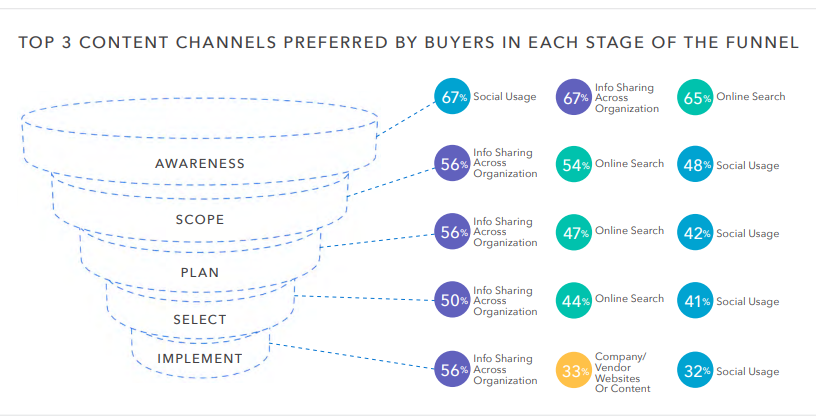 그리고 이 과정에서 57%의 의사결정자들은 협력체의 영업사원을 만나기 전에 제품에 대한 구매 결정을 내리는데, 이 과정에서 관련 정보를 수집하는 방법으로 온라인 리서치 (27%) > 외부 자문(22%) > 잠재협력사 방문(18%) > 오프라인 리서치 및 기타(33%, 오프라인리서치와 기타를 합친 퍼센티지) 를 활용하는 것으로 나타났습니다.