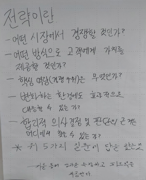 내가 깜짝 놀란 답은 전략에 대한 ‘질문’을 써준 조였다. 이들 조에 경영학이나 상경계열 조원이 있었는지까지는 확인을 못했지만, 그럼에도 이 결과물은 지금까지 수많은 전략기획 워크숍 중 백미였다.