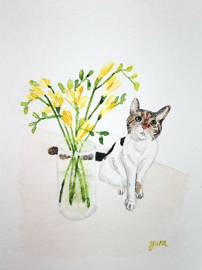 프리지아와 우리집 고양이 파브르를 수채화로 그려보았어요. 노랑색 점 몇개로 이쁜 프리지아가 만들어져서 마음에 싱긋 미소가 지어집니다. 고양이 과학자 파브르는 무슨 생각을 하는 걸까요?