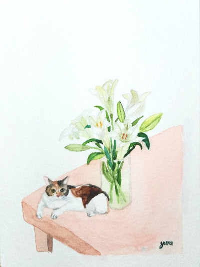 가까이에서 백합을 감상하고 싶지만 고양이를 위해 그 마음을 접어둡니다. 그래도 아쉬운 김에 백합 꽃병 옆에 있는 고양이 파브르를 상상하여 그려보았어요. 상상으로 그렸더니 실수로 고양이를 꽃에 비해 너무 작게 그려버렸네요. 그래도 나름 귀여운 모습입니다.