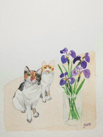 붓꽃은 여러해살이 구근 식물로 많은 구근 식물들이 그렇듯이 고양이에게는 독성이 있어 위험할 수 있어요. 하지만 식물원에서 본 청초한 붓꽃 군락이 머리에 계속 떠올라 수채화 그림을 그리게 되었답니다. 식물원에서 사진으로 찍은 부채붓꽃을 제 나름대로 그림에서 화병에 담가보았어요. 부채붓꽃은 특이하게도 다른 붓꽃과는 다르게 잎이 세 개 밖에 없어서 다른 붓꽃에 비해 덜 풍성하지만 나비가 나풀거리는 모습 같아 귀엽습니다. 그 옆에는 뭔가 지시를 기다리는 듯한 말썽쟁이 고양이들이 저를 보고 있어요. 파브르와 올리브 모두 애교쟁이에 털도 고운 사랑스러운 고양이들이지만 가끔 새벽에 우당탕탕 술래잡기를 하는 바람에 저와 남편 그리고 작은 아기가 모두 잠이 깨버리곤 합니다. 힘들게 재운 아기를 깨운 벌로 요즘은 고양이들과 분리수면을 하고 있어요. (그전에는 한 침대에 사람 둘에 고양이 둘이 함께 자는 바람에 침대가 어찌나 비좁던지요.) 처음에는 고양이들이 문을 열어달라고 애처롭게 울었지만 어느새 적응하여 각자 소파에 한편씩 자리를 잡고 수면을 취하더랍니다. 마침내 적응을 한 모습 또한 기특하고 귀엽습니다.