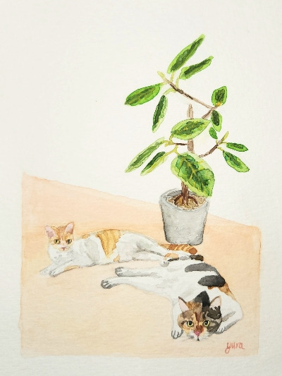 이번에도 올리브와 파브르 두 고양이를 모두 고무나무와 함께 그려보았어요. 모아두고 보니 일종의 가족 그림입니다. 요염하게 누워있는 올리브와 호시탐탐 또 무슨 장난을 칠까 고민하는 파브르 모두 귀엽고 사랑스럽습니다.