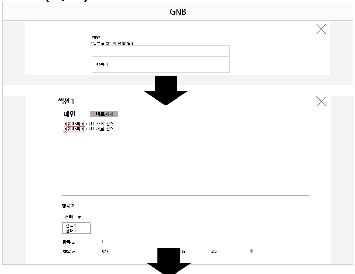 출처: 고영 태크 놀로지 이동석 UX실장, UX Design for Productivity, HCI2019그렇지만 눈을 떠 하늘을 보라. Enterprise UX에도 Mobile First의 시대가 왔다. 못믿겠다면 전통의 강호 IBM이 선언하는 Mobile First내용을 살펴보고 오자. 물론 말했듯이 복잡한 UI가 안 좋다는 건 아니다. 지금 얘기하려는 건 맥락이다. 앱 서비스들은 아무래도 전통적인 웹 서비스보다는 복잡도가 떨어졌다. 표현할 수 있는 면적 자체가 비교도 안되게 좁았으니까. 제약조건이 서로 다른 상황에서 앱 서비스는 웹 서비스와는 또 다르게 UI가 발전해왔다. 그런데 이제는 디바이스의 발전으로 웹도 모바일 대응을 하지 않을 수 없게 되었고 심지어는 '모바일퍼스트'가 되어가면서 거꾸로 앱의 UI가 웹으로 흘러들어오게 된 것이다. 이런 흐름 위에서는 서비스 기획자 스스로의 행복을 위해서라도 '앱'같은 UI를 늘 염두에 두는 것이 좋다. 평소에 다루는 것들과 이질감이 없어야 대표슨생님도 그렇고 리드도 그렇고 안을 통과시키고 다음 논의를 이어가고 싶어 질 것 아닌가. 이제는 '뭘 그렇게까지'라는 반감을 아직 가지고 있는 내가 바뀌어야 하는 것이다. 그렇게 완성해 간 와이어프레임 3단 변화 보시죠.
