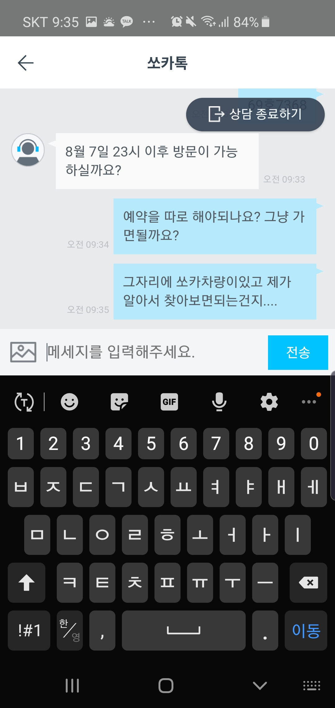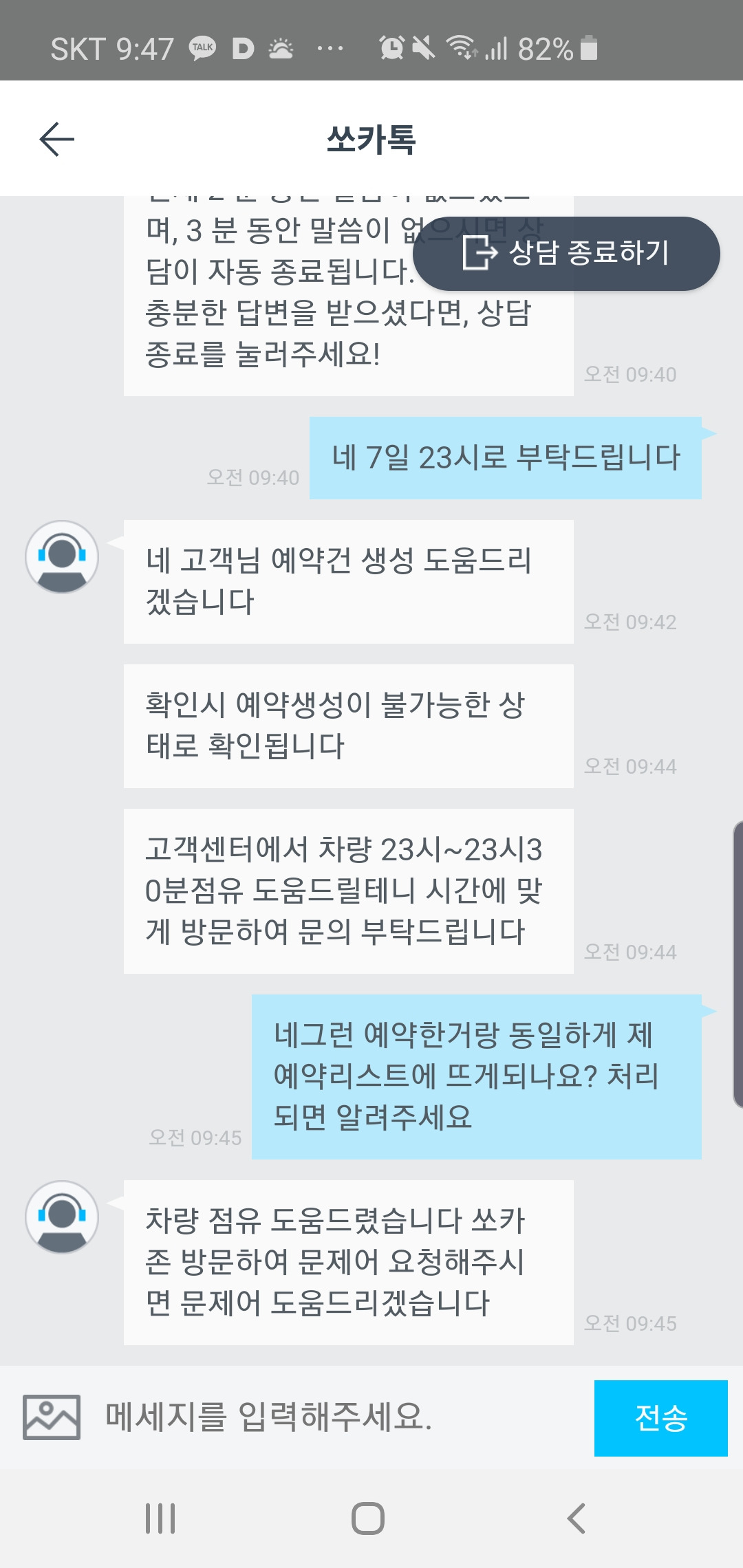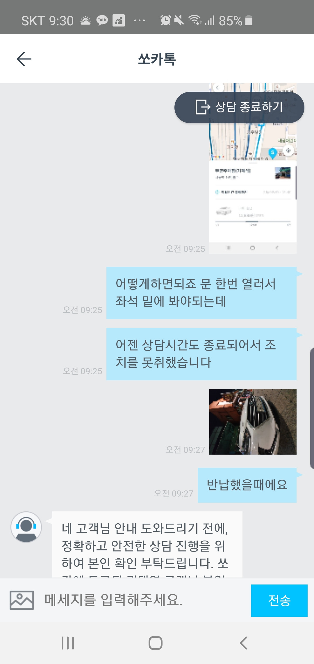 이미 쏘카 반납을 했는데 운전석 쪽에 개인 키가 떨어진 것으로 강력하게 의심되는 상황. 이게 렌터카였으면 한 번만 문 좀 열어주세요 라고 할 텐데 싶은 거다.게다가 반납 시간은 이미 고객센터 운영시간이 종료된 뒤. 그렇다고 바로 다시 빌릴 수도 없는.(경미한 사고가 있었기 때문에 비활성화가 되어있었다.) 결국 그 날은 집에 가지 못하고 다음날 날이 밝기를 기다리는 수밖에 없었다. 날이 밝자마자 문의해보니 반납 후 10분 내에 문 제어가 한 번은 더 가능했다는데 그게 무슨 소용입니까. 기능이 눈에 띄지 않았는걸요?