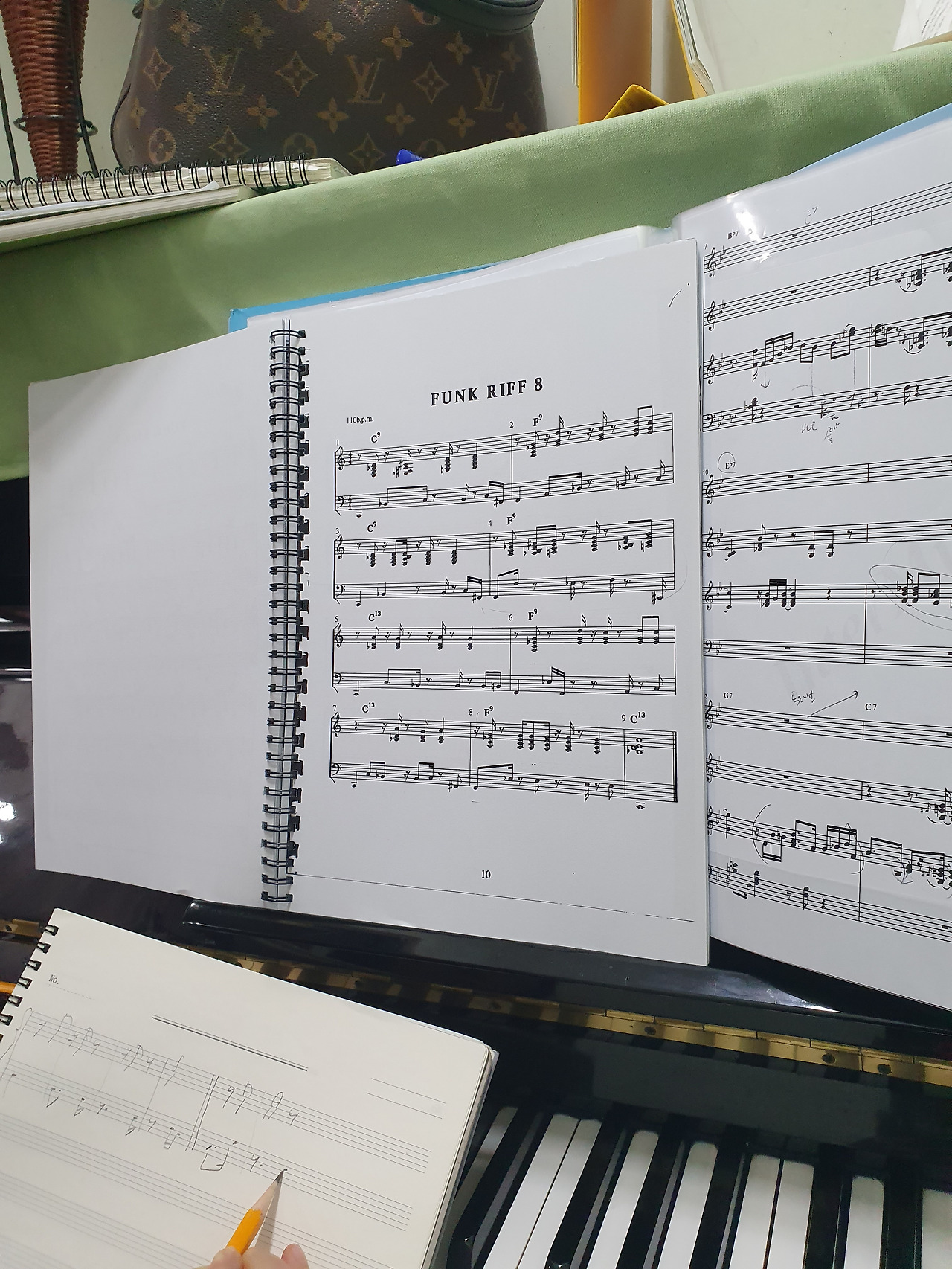 지금까지 배웠던 리듬들을 모조리 참조하여 지금 내가 구현해야 할 음악에 맞는 리듬을 딴다. 적용한다. 변형한다. 어떻게? 왼손에 bass음+3,7음을 기본으로 옥타브로 변형해보고, 5음 추가해보고 강세를 바꿔보면서. 피아노 위에 놓인 책은 60 of the Funkist Keyboard Riffs Known To Mankind로 웬만한 클리셰는 여기에 다 있습니다. 이 중 장르 'funk'인걸 참조하여 박자를 따면 내가 원하는 느낌은 다 낼 수 있어.(제가 훵크를 좋아해서 그렇습니다.) 이제 바이블이 있으니 이 느낌을 가지고 사운드를 만들어본다.