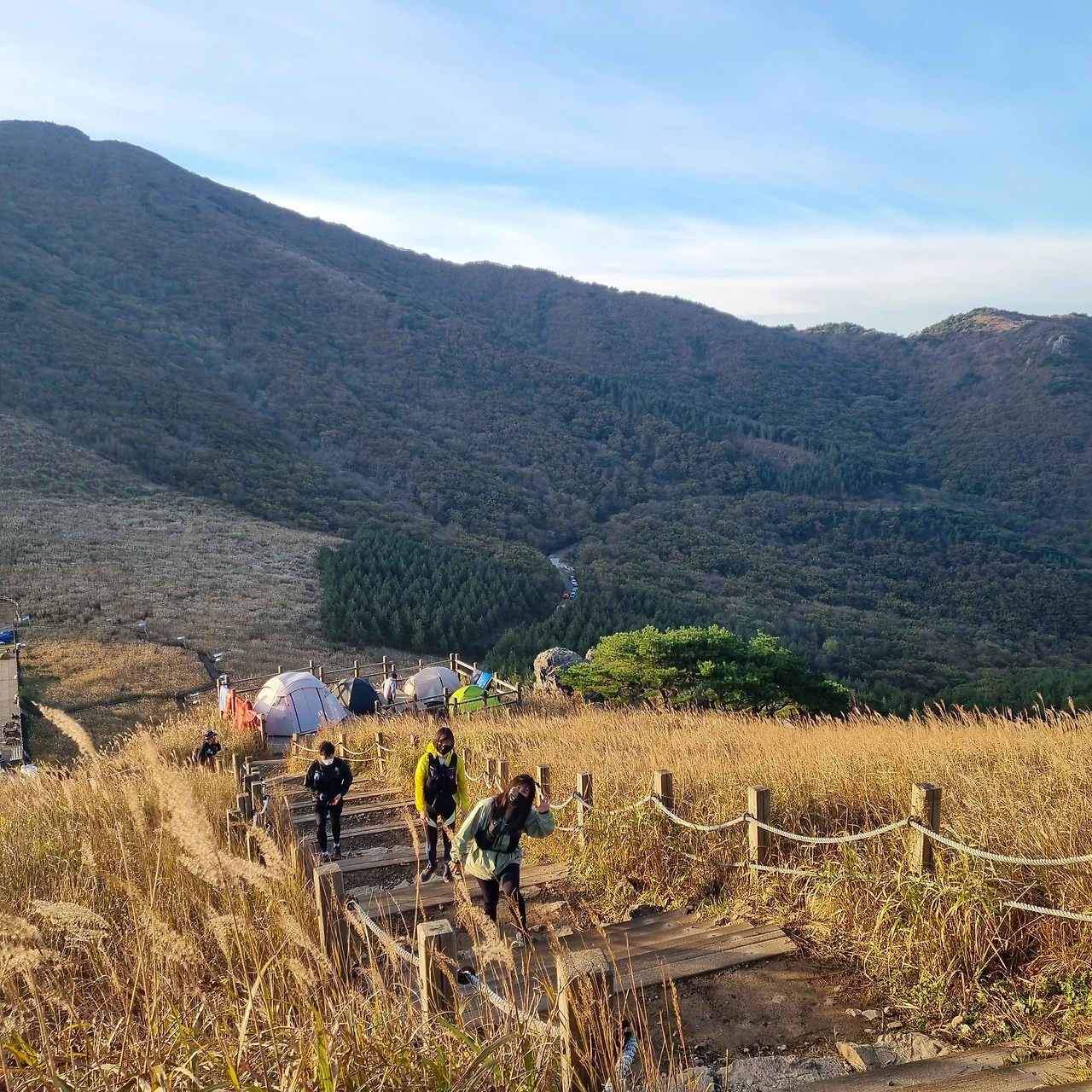 영남알프스를 목표로 하는 트레일 러닝 프로그램에 참가했다. 8주간 서울 시내 여기저기의 산에서 훈련을 마치고 드디어 당일. 오후 11시 사당에서 집결하여 전세 버스를 타고 이동했다. 오늘의 코스는 간월산 찍고 돌아내려와서 임도를 따라 계곡까지 내려온 후 다시 신불산 정상을 찍고 돌아오는 2 Peak 코스. 5 Peak 코스를 달리는 참가자들은 열심히 뛰어야겠지만, 나는 설렁설렁 풍경을 즐길 마음이었다. 잠깐 눈을 붙였다 새벽 3시, 휴게소에서 간단한 식사를 했다. 전날 카페에서 산 잠봉 뵈르를 먹었는데 새벽에 짭조름하니 급하게 열량 채우기 좋았다. 이제 오후까지 뭘 못 먹으니까 포도당 사탕 잘 챙기고. 복합웰컴센터에 도착한 우리는 달빛을 받으며 다 같이 빙 둘러 몸을 풀었다. 단체 사진을 찍고 조별로 산을 오르기 시작했다. 첫새벽 등반이었다. 조금은 졸아있었는데 다행히도 등반하자 1시간이 채 안되어 산 너머로 해가 고개를 내밀었다. 아침 해를 마주하며 오르는 황금빛 간월산 풍경이 호사로웠다. 간월재였다. 반대로 조금 더 올라 간월산 정상석을 찍고 계곡길을 따라 임도로 내려갔다. 길 따라 만난 폭포에 잠깐 앉아 등산화를 푸르고 쉬다가 신불산 휴양림 주차장 쪽으로 걸음을 옮겼다. 그곳에서 프로그램 측에서 마련해 준 사과, 핫바, 음료수, 바나나. 얼마나 꿀맛이든지. 다시 힘내서 잘 갈 수 있을 것 같았다. 기분 탓이었다. 지금까지 내리막을 제외하고는 걸어왔는데도 다시 오르는 신불산 초입의 경사가 어마어마했다. 이정표도 한번 놓쳐서 어리둥절했다. 다시 정신 차려 영축산 쪽을 향하다가 신불산 정상이 보이기 시작했을 때 즈음. 돌아본 신불산 자락 풍경이 어마어마했다. 억새에 구름 그림자가 드리워져 시시각각 표정을 달리하고 있었다. 아… 나는 결국 나머지 7봉도 다 오르게 되겠구나 생각했다.