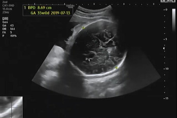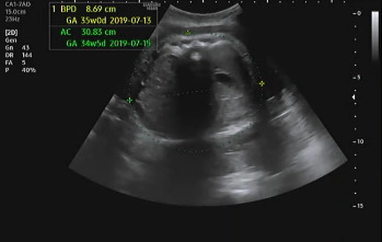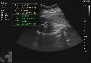 진료 순서가 되어 복부 초음파를 확인하였다. 여전히 햇님이는 자신의 건강함을 알리기 위해 초음파를 보는 내내 손을 이리저리 움직였다. 머리둘레, 복부둘레, 허벅지 뼈 길이를 측정하여 대략적인 체중을 확인하고 태아가 주수에 알맞게 크고 있는지를 확인했다. 머리둘레는 35주 차, 복부둘레는 34주 5일, 허벅지 뼈 길이는 33주 4일이라서 이상하다 생각했는데 평균적 수치는 주수에 알맞게 성장이라는 것을 듣고 안심했다. 2주 뒤인 37주 차에 내원을 예약했다.
