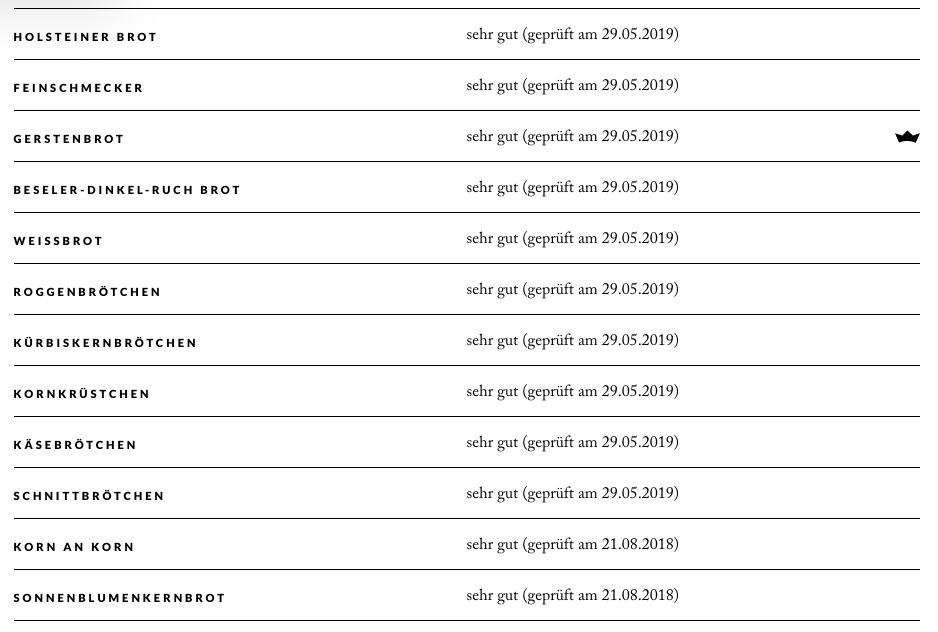 링크에는 영업 시간과 위치가 나와있고 어느 빵이 어떤 등급을 받았는지도 명시해 놓았다. 내가 제일 좋아하는 호박씨빵(Kürbiskernbrötchen) 또한 2019년 5월 19일 sehr gut 등급을 받았다.