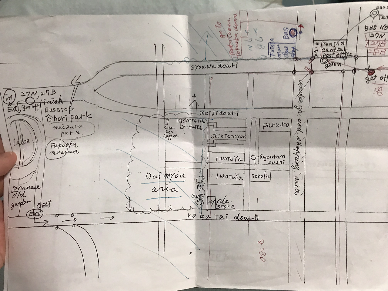 휴대폰 배터리를 아끼느라 아까 친절하게 그려준 치에코 상의 약도를 펼쳐본다. 지나칠정도로 친절한 호의라고 생각했는데 결국 어디선가는 빛을 발하는 마음이었다. 버스정류장을 세세하게 그려놓은 그녀의 약도에 기대어 텐진 근처 나카스 역에서 하차했다.