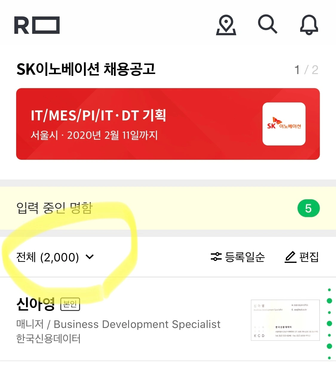 오늘은 리멤버에 관리중인 명함 갯수가 2,000개가 된 날이다.