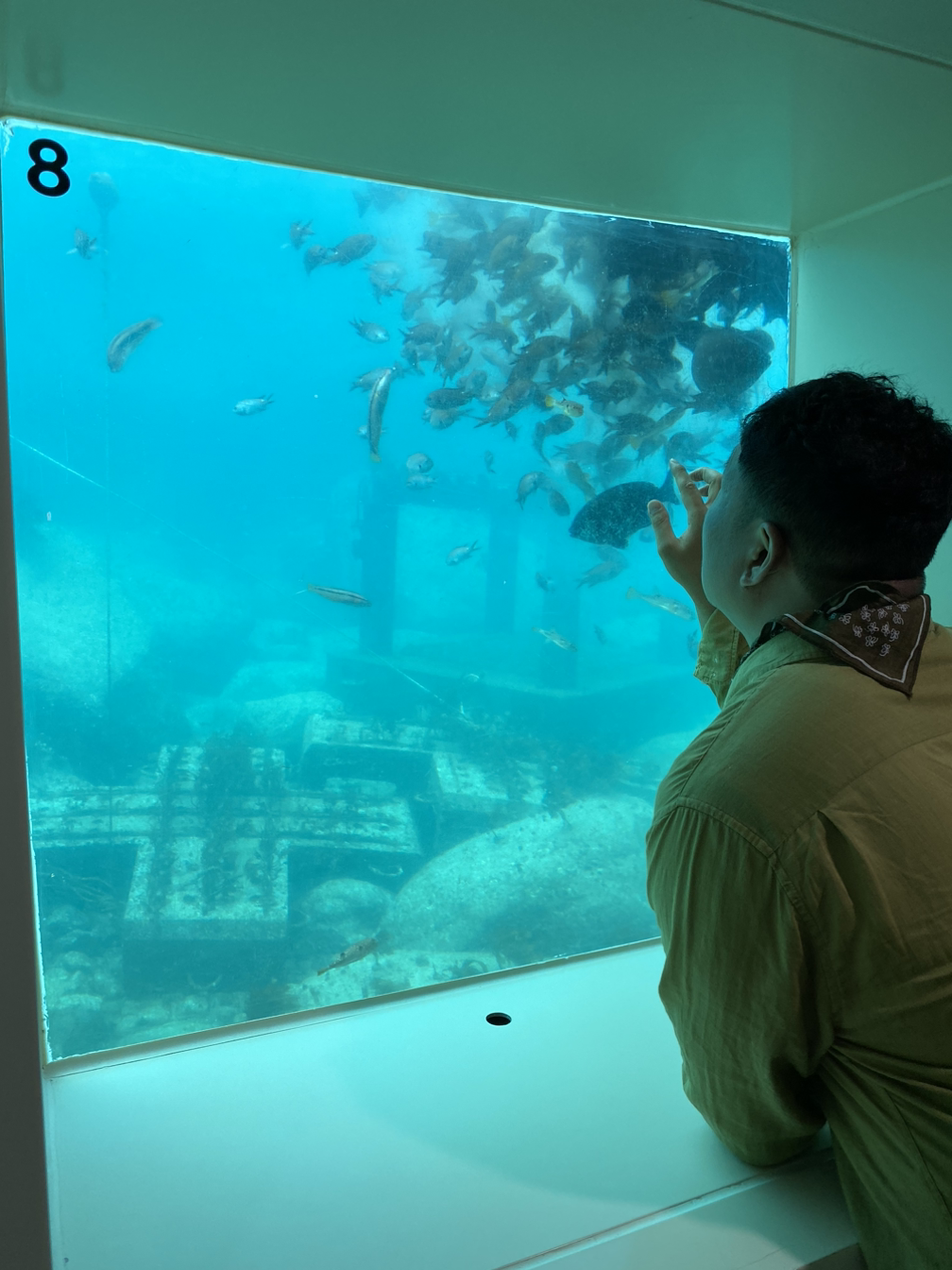 가는 길이 바다 위에 있어 서서 그런지 마치 신비한 곳으로 들어가는 입구처럼 보였다. 문을 열고 들어가면 다소 시원하다 못해 서늘한 바람이 불어온다. 에어컨이 있는 건물이기도 했지만, 건물이 높게 보다는 깊이 지어진 탓에 서늘함이 있었다. 계단을 타고 내려가면 내가 서있는 위치가 수심 몇 미터가 되는 지점인지 알 수 있게 표시가 되어있고, 조금씩 공기의 무게가 느껴지기 시작했다. 나는 못 느꼈지만 내 친구는 수압을 잘 느끼는 터라 그 속에 조금만 있어도 머리가 아파오고 숨을 쉬기 힘들었다고 하는데, 나는 그 정도 까진 아니었다.