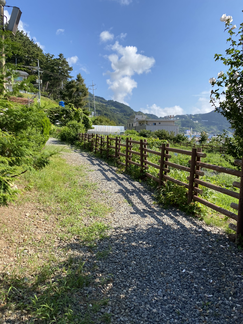 차를 타고 오르내리며 봤던 풍경은 이곳의 표지라고 한다면 내가 걸어가면서 보고 있는 고양이와 작은 들풀들, 눈앞에 보이는 바다와 잔뜩 초록을 머금고 있는 나무와 풀들이 진짜 내용이었다. 거기다가 바람과 풀들이 만나 만드는 시원한 소리가 바닷가에서 들려오는 파도소리는 음악을 들을 필요가 없을 정도로 귀에 소리를 담아 주었다. 심지어 바람이 살 곁을 지나기만 해도 시원해지는 기분은 산책을 더욱 귀한 시간을 기억시켜 주는 필요조건이 되었다.