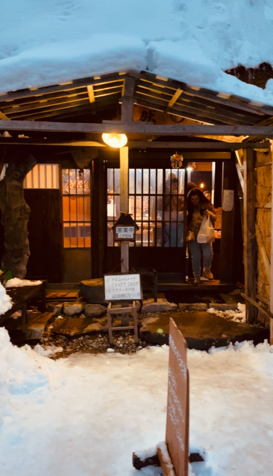 풍경에 넋이 나가 길을 따라 한참을 걸으니 체온이 많이 떨어져 버렸다. 따뜻한 게 마시고 싶어 내려와서 가장 먼저 들어간 곳은 기념품 가게였다. 아무래도 기념품 파는 곳은 상품만 놓고 팔지는 않으니 기념품도 살 겸 따뜻한 거라도 마실 겸 가게 앉으로 들어갔다. 일본 문화 특유의 따뜻한 환대 속에서 우릴 맞아 주셨다. 가게는 역시 이곳의 전통 방식 그대로를 유지한 모습의 건물이었다. 문을 오른쪽으로 밀어내며 들어간 가게의 모습은 통나무 집에 들어온 것처럼 나무 결이 보이는 벽과 따뜻한 온도의 공기가 우릴 맞이한다. 이곳의 시간으론 다소 늦은 시간인 듯 많은 물건은 빠져 있고, 가게 안에 사람들은 많이 보이지 않아 분위기가 좋았다.