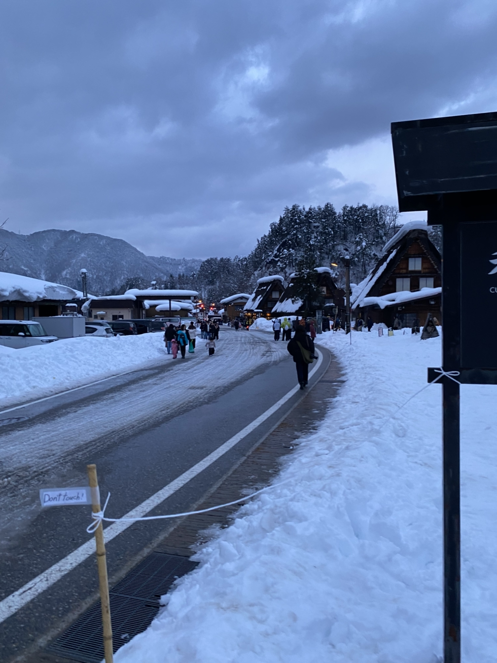 다시 버스는 우리가 왔던 나고야를 향했다. 눈 덮인 마을을 벗어나 버스는 고속도로 위로 올랐고, 수많은 버스들이 마을을 빠져나오기 시작했다. 우리가 상점에 들렀다가 나온 시간이 버스 집결시간에 근접했기 때문에 우리가 나 온 다음 가게 분을 닫고 정리하는 모습이었다. 이미 문을 닫은 가게들도 많이 있었다. 가로등이 하나둘씩 켜졌고, 집집마다 불이 들어왔다. 그 모습만 보고 버스 위로 올랐는데, 버스가 고속도로로 진입하는 동안 마을을 반바퀴 정도 돌아 나오게 되었는데, 오르막 길이 위에서 불 켜진 마을을 보는 모습이 전망대에서 보는 모습과는 차원이 달랐다.