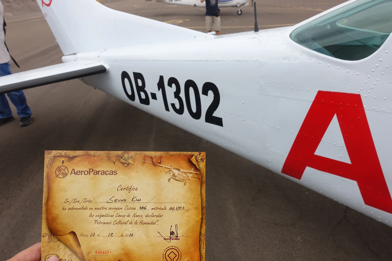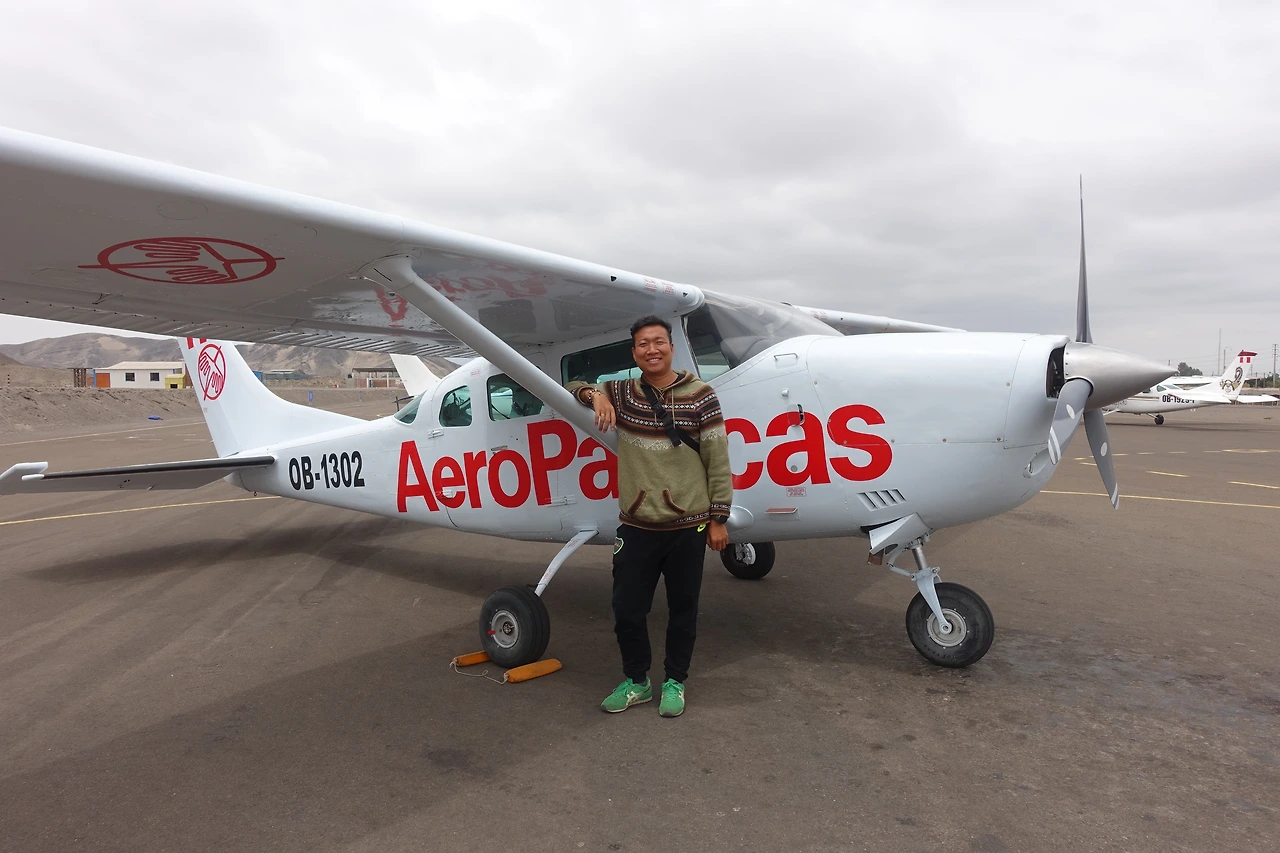 나스카에 도착해 비행장으로 향했다. 태어나 처음으로 경 비행기를 타 볼 수 있는 시간이었다. 비행기의 몸체가 겨우 내 키 정도의 높이 밖엔 안되는데, 두 명의 조종사와 두 사람의 관광객이 비행기에 오른다.