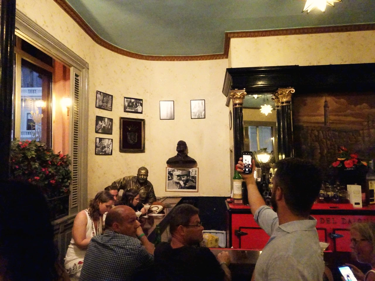 가게 안은 도무기 복잡해서 누가 누구와 한 그룹 인지도 모를 정도이다. 한쪽에서 자리가 나면 망설이지 말고 일단 앉아 주문을 할 수밖에 없는 곳이다. 멍하니 기다리고 서 있다가는 자리 잡기는 쉽지 않다. 밴드가 연주를 계속하는 동안에도 사람들이 밀려들어 오고, 자신의 차례가 된 사람들만 헤밍웨이의 옆에 앉아 술을 마시며 과거의 어느 날 이곳에서 술을 마시던 헤밍웨이의 기분을 조금이라도 느끼고 싶어 한다. 사진을 찍고 가야 하는 건 모든 나라 공통이라 사진을 찍기 위해선 줄도 서있어야 했다.