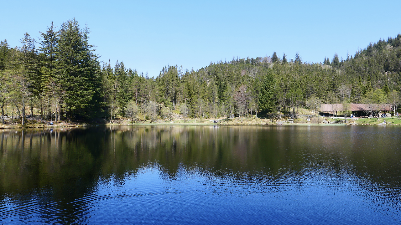 잠시 여유를 부리니 하늘은 더 파래졌고 길을 따라 걸었다. 갈림길의 안내표지판은 어디로 갈지 고민하게 하였고 끌리는 곳으로 향했다. 발길 닿는 대로 걷다 보니 숲으로 둘러싸인 또 다른 호수를 발견했다. 호수 앞에는 주변 자연과 일체화된 듯한 카페가 있었다.