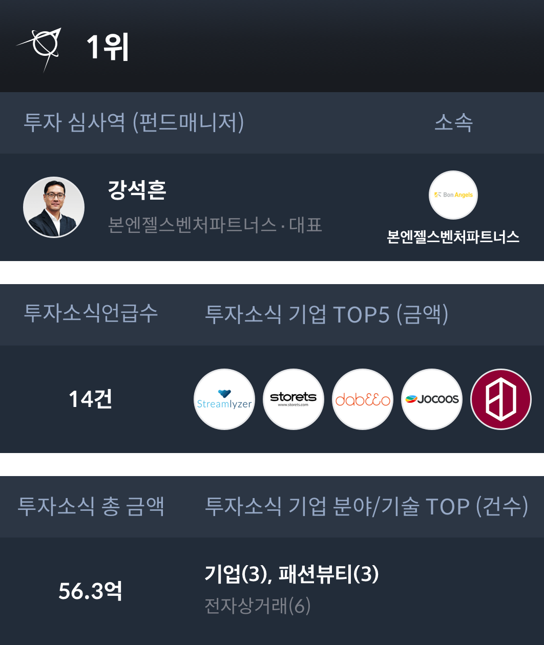 1위에 올라간, 본엔젤스벤처파트너스의 강석흔 대표에 대해 더 알아보겠습니다.