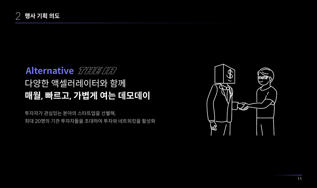 3. 선정된 기업의 투자 설명서를 미리 배포해, 관심있는 기관 투자자들만 초대합니다.