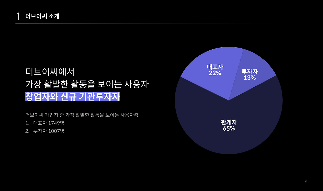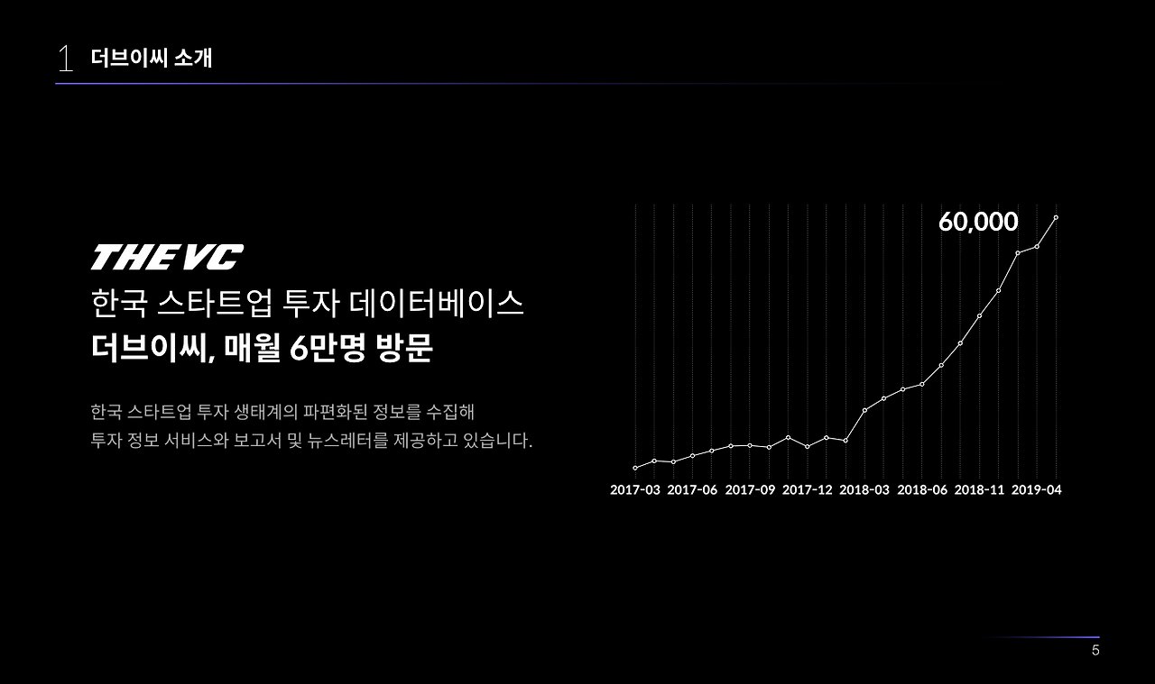 현재 매월, 6만명이 더브이씨를 방문해 스타트업과 기관투자자를 검색하고 있습니다.