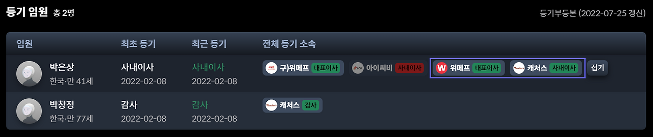 캐처스의 등기임원 중 박은상 대표이사의 전체 등기 소속 정보를 보면, 캐처스 외에 위메프 등기이사로도 등기된 사실이 확인됩니다. 즉, 위메프 대표를 지낸 박은상 대표의 이력이 캐처스의 경쟁력을 높게 평가함에 있어 상당히 중요한 요인으로 작용했을 것으로 짐작해 볼 수 있는데요. 실제 캐처스 프로필 페이지에 링크된 가장 최신 뉴스 기사를 보면, 이번 투자를 리드한 알토스벤처스의 박희은 파트너가 "위메프 연거래액을 10년간 약 600억에서 6조까지 성장시켰던 박은상 대표의 실행력과 판단력을 믿었고 쉽지 않은 도전을 해낼 수 있을 것이라 확신해 이번 투자를 결정하게 됐다"고 밝히는 등, 투자 결정에 있어 박은상 대표의 위메프 경력이 중요하게 고려되었음을 알 수 있습니다.