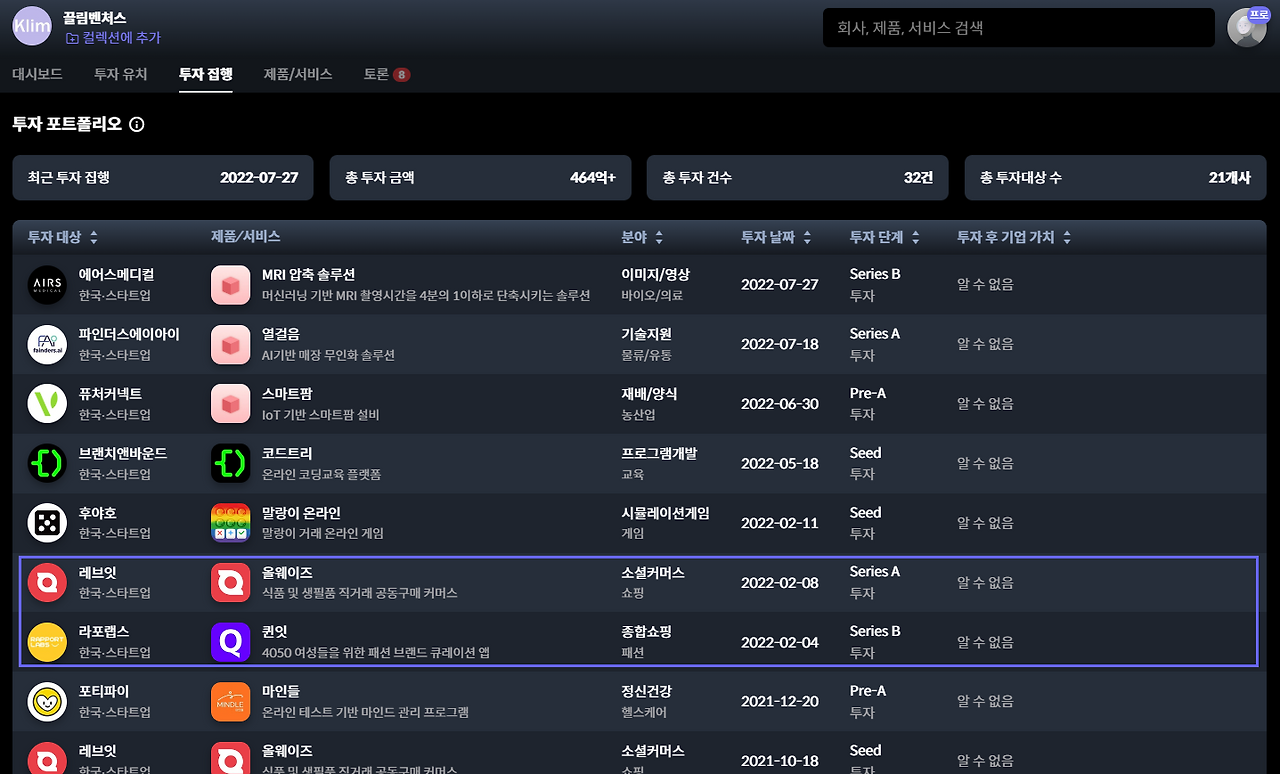 레브잇의 투자사 끌림벤처스로부터 투자를 유치한 또 다른 이커머스 스타트업이자, 4050 여성들을 위한 패션 브랜드 큐레이션 앱 '퀸잇'을 운영하고 있는 '라포랩스' 역시 주목해 볼 만한 업체입니다. 끌림벤쳐스가 시드와 시리즈 A, 시리즈 B 총 세 라운드에 걸쳐 투자에 참여한 라포랩스는 올해 6월 자회사 '라포테이블'을 스핀오프하고, 지난달 27일 소프트뱅크벤처스와 베이스인베스트먼로부터 35억 원 규모의 프리-A 라운드 투자를 유치한 상태입니다.