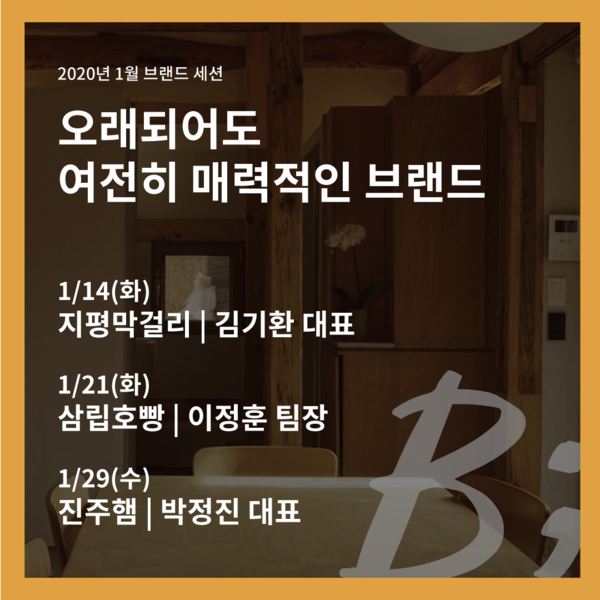 맛있고 알찬 브랜드 이야기로 가득한 Be my B는 2020년 1월 오래되어도 여전히 매력적인 브랜드란 주제로 3개의 맛있는 브랜드와 함께 할 예정입니다. 1925년부터 막걸리를 빚기 시작해 4대째 이어오며 우리 술 트렌드를 바꾸고 있는 지평막걸리의 계속되는 도전. 1971년 10월 출시한 삼립식품의 찐빵 브랜드가 겨울 대표 브랜드의 자리매김하며 사랑받을 수 있었던 비결. '분홍 소시지', '줄줄이 비엔나', '천하장사'로 잘 알려진 진주햄이 맥주 브루어리를 함께 운영하기 까지! 2020년에도 Be my B와 함께해주세요 :)