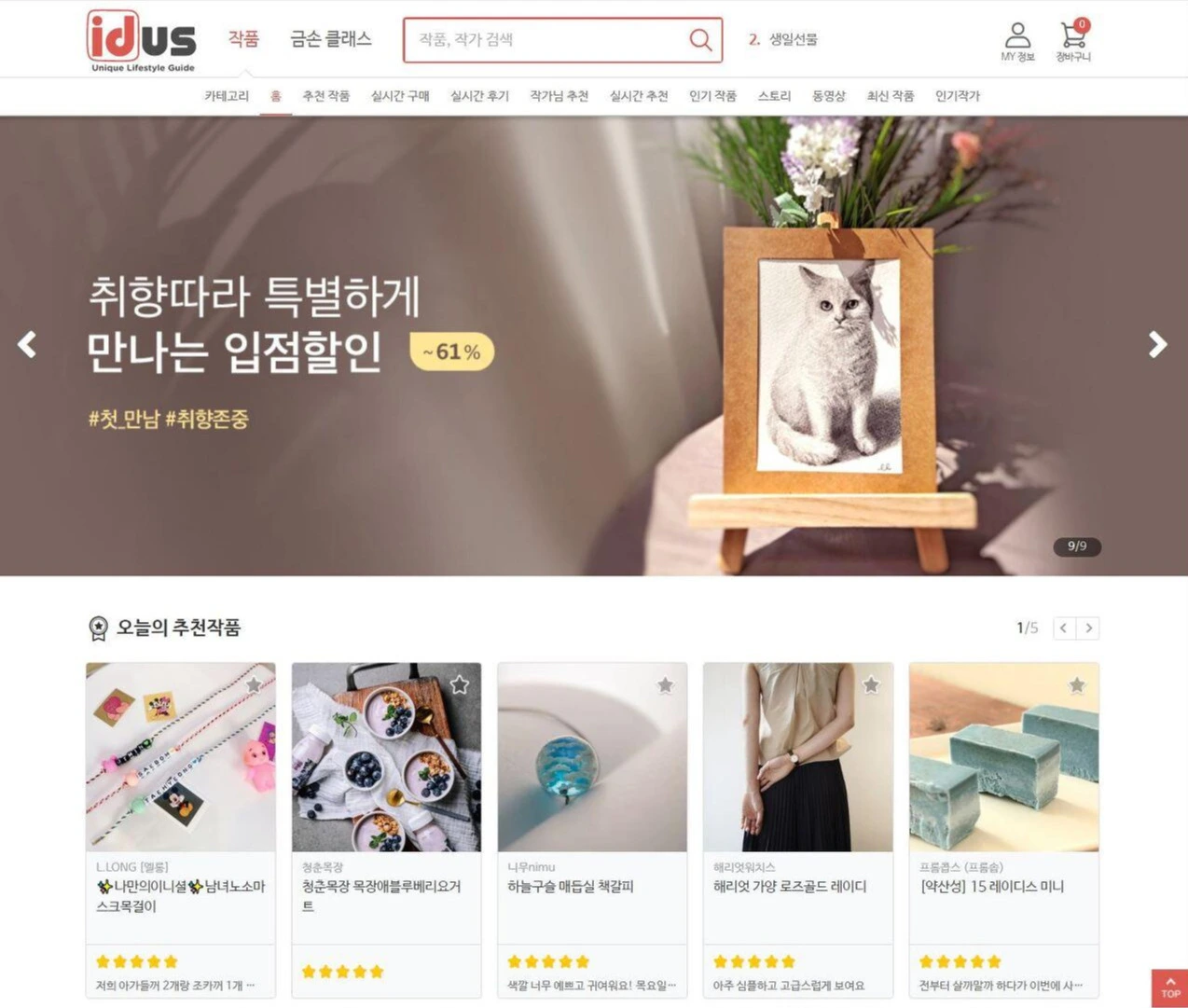 아이디어스는 Unique Lifestyle Guide 하늘 아래 같은 핸드메이드는 없으니까!라는 슬로건 아래 2014년 출시되었습니다. 핸드메이드 작품을 작가가 직접 등록/판매하는 마켓 플랫폼 역할을 하고 있습니다. 2020년 6월 기준으로 약 1만 8천 명의 작가가 입점하여 수공예 액세서리, 디저트, 공예품 등 36개의 카테고리에 달하는 작품을 판매하고 있는데요. 아이디어스에서 판매하는 상품들을 작품이라고 칭하고, 판매자를 작가라고 칭하는 점에서도 아이디어스가 바라보는 방식을 엿볼 수 있는 것 같습니다. 5년 사이 엄청난 성과를 일군 아이디어스는 2020년 일 매출액 10억을 돌파하며 최근 300억 규모의 투자를 유치했죠.
