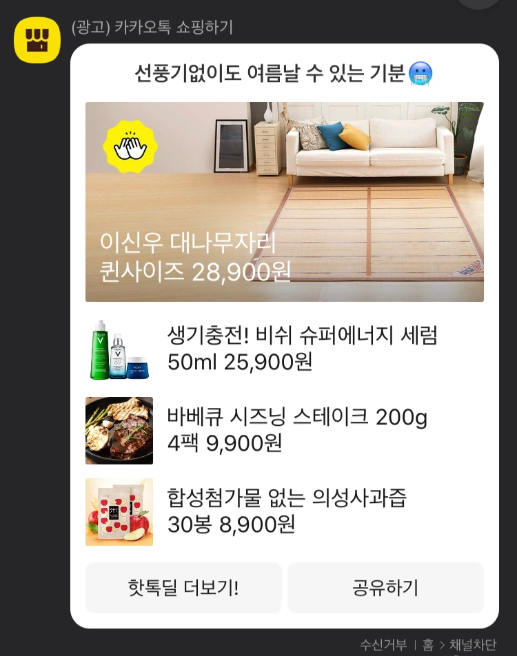 카카오는 쇼핑하기, 선물하기 등으로 커머스를 운영하고 있는데요. 판매자에게는 톡딜 할인 기능과 다양한 노출 채널을 패키지로 제공하여 마케팅 고민을 덜어주고, 사용자에게는 2명만 모이면 할인가에 상품을 구매할 수 있는 공동구매 서비스 '톡딜'을 쇼핑하기에서 제공하고 있습니다. 메시지를 통해 핫톡딜을 살펴볼 수도 있죠. 카카오 입장에서는 11번가의 더보기 탭 버튼이 크게 메리트로 작용하지 않을 수 있기 때문에, 두 커머스의 결합은 어떠한 형식으로 시너지를 일으킬지 조금 지켜봐야 할 것 같네요!