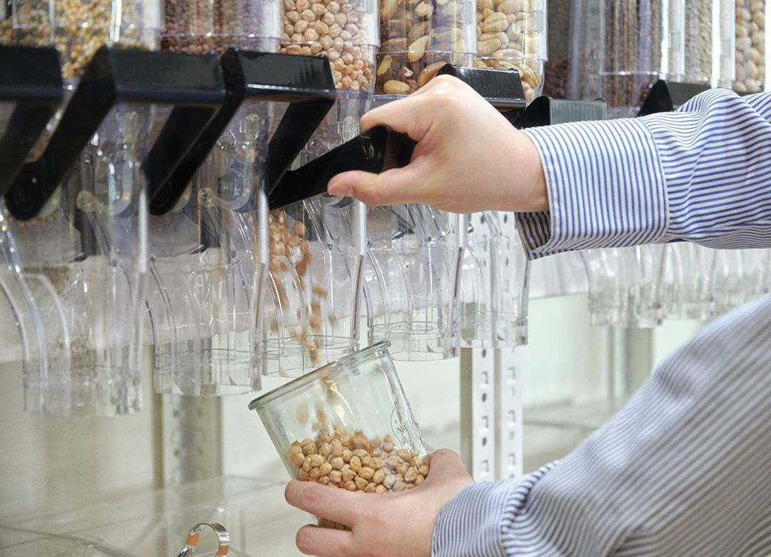 더 피커는 브랜드 가치를 실현하기 위해 어떠한 노력을 하고 있는지 살펴볼까요? 소분 포장 없이 제품을 들여와서 포장하지 않은 상태로 진열합니다. 소비자들은 물건을 담아갈 수 있는 주머니나 용기를 가져와서 제품을 구매하죠. 온라인으로 주문이 들어온 상품의 배송은 한번 사용된 깨끗한 택배 박스를 기부받아 재사용합니다. 또한 친환경 종이 완충제 및 기부받은 종이 포장재를 재사용하여 충격을 보완합니다. 포장의 마무리 단계인 테이프는 재사용 상자가 폐기되는 지점을 고려하여 코팅이 없고, 컬러&로고 인쇄가 없는 제품을 선택합니다. 더피커의 로고를 이용하지 않아도, 포장의 곳곳에서 더 피커의 가치가 그대로 담겨있는 것이 특징입니다. 직접 매장에서 픽업하는 것을 선택하면, 매장에 크기 별로 준비된 대여 용기 혹은 직접 가져온 용기에 식재료를 담아주는데요. 오프라인에서는 포장이 필요 없는 패키지 프리 상점을 추구하고 있는 것이죠.