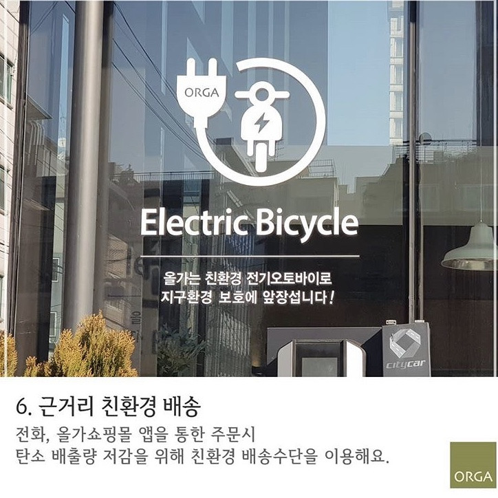 매장을 지속 가능하게 운영하기 위해 다양한 아이디어를 실천하고 있는데요. 올가홀푸드 매장 내에서 사용하는 영수증, 트레이, 빨대, 도시락 용기를 생분해성 재질로 만들어서 사용합니다. 또한 전기 이륜차, 전기 자동차 등의 친환경 운송수단을 사용하여 친환경 배송 서비스 활성화를 시도하죠. 전국 직영매장과 본사 사무실에서는 100% 사탕수수로 만들어진 친환경 복사용지를 도입해 사용하고 있다고 합니다. 사탕수수 부산물로 만들어진 용지는 나무로 만들어진 제지와는 다르게 산림훼손이 이루어지지 않고, 화학 표백제를 이용하지 않아 환경오염을 줄이는데 일조합니다.