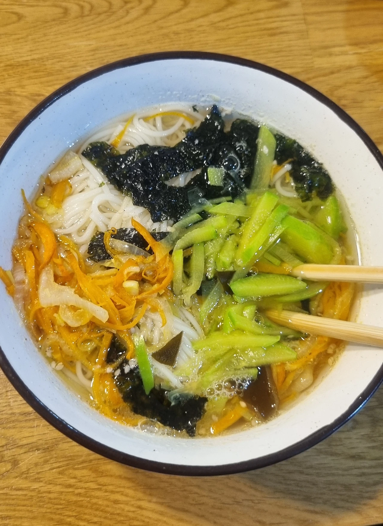 모처럼 둘째에게 국수 주문을 받은 바보아빠는 평소보다 더 정성 들여 육수를 내고 애호박과 당근으로 고명을 준비하여 국수를 만들어내었다.