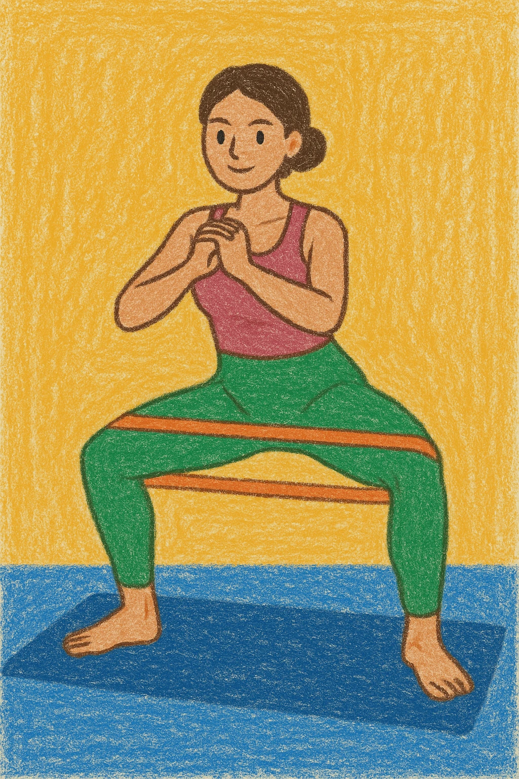 밴드를 허벅지에 끼고 매트 끝에서 끝으로 와이드스쿼트 자세를 유지한 채로 한 발씩 이동하였다가 다시 제자리로 돌아온다.