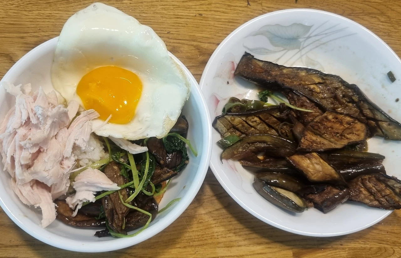 3. 밥 위에 가지볶음, 잘게 뜯은 닭가슴살, 반숙으로 요리한 계란 프라이를 올린다.