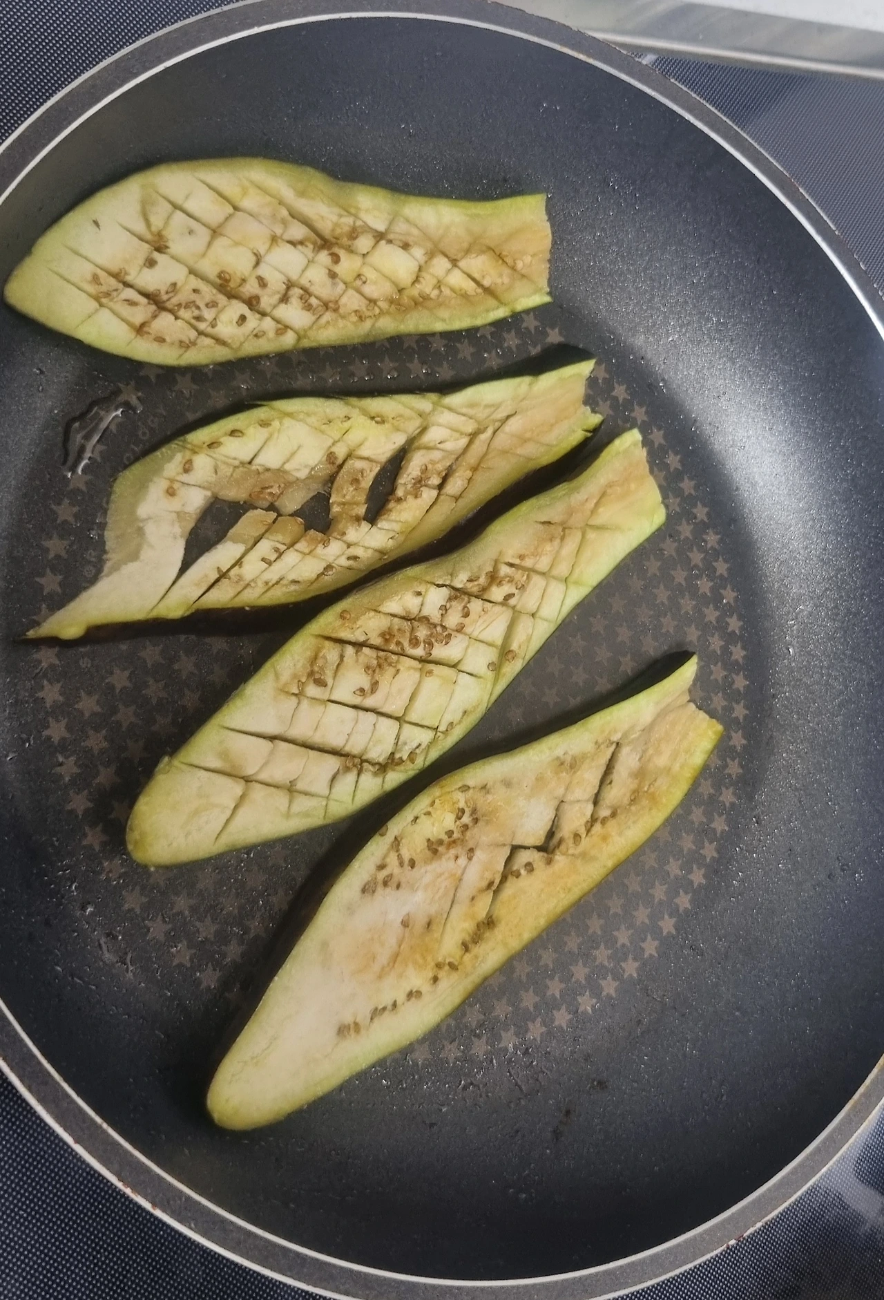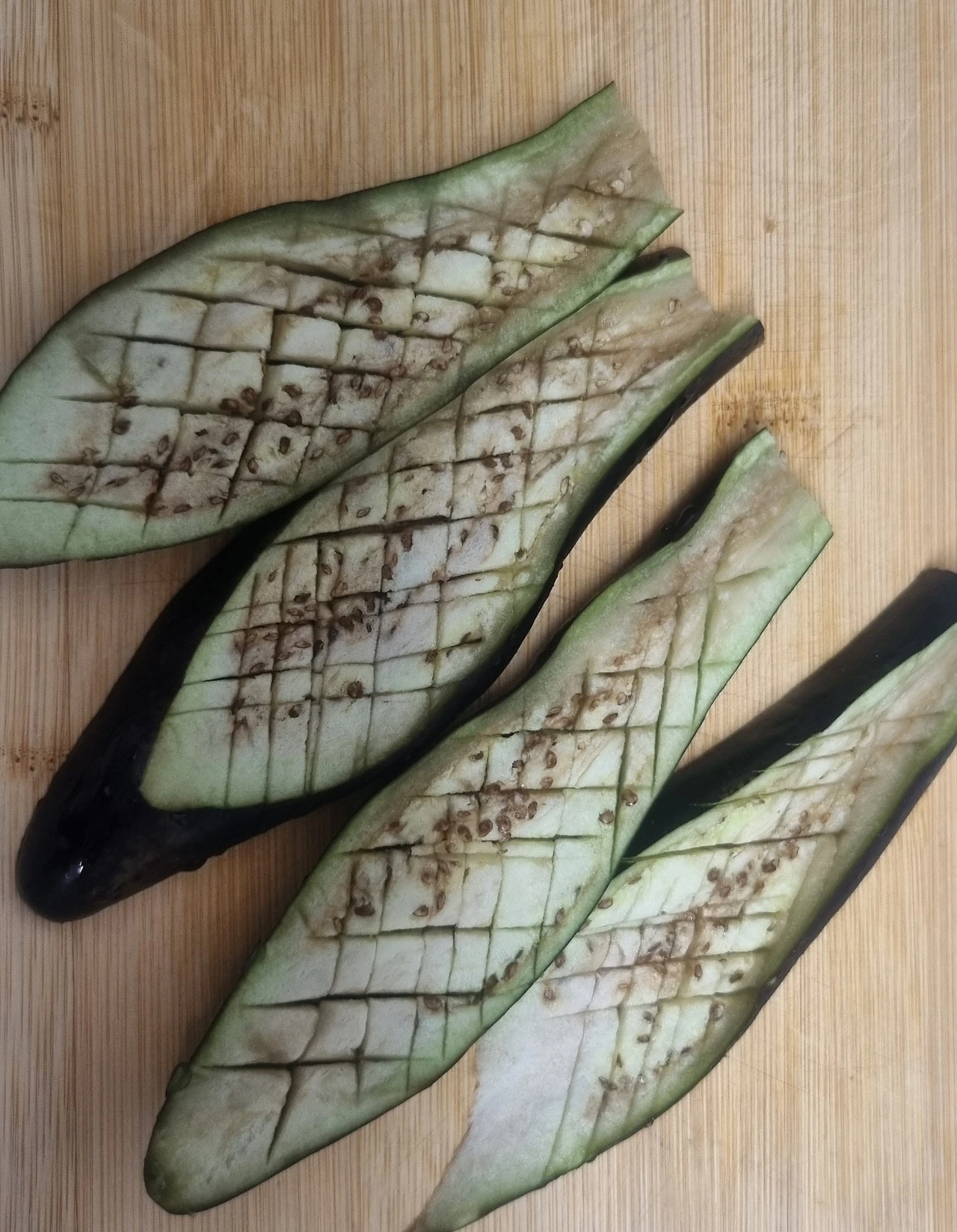 1. 가지를 잘라서 양념이 잘 배도록 격자무늬로 칼집을 낸다.