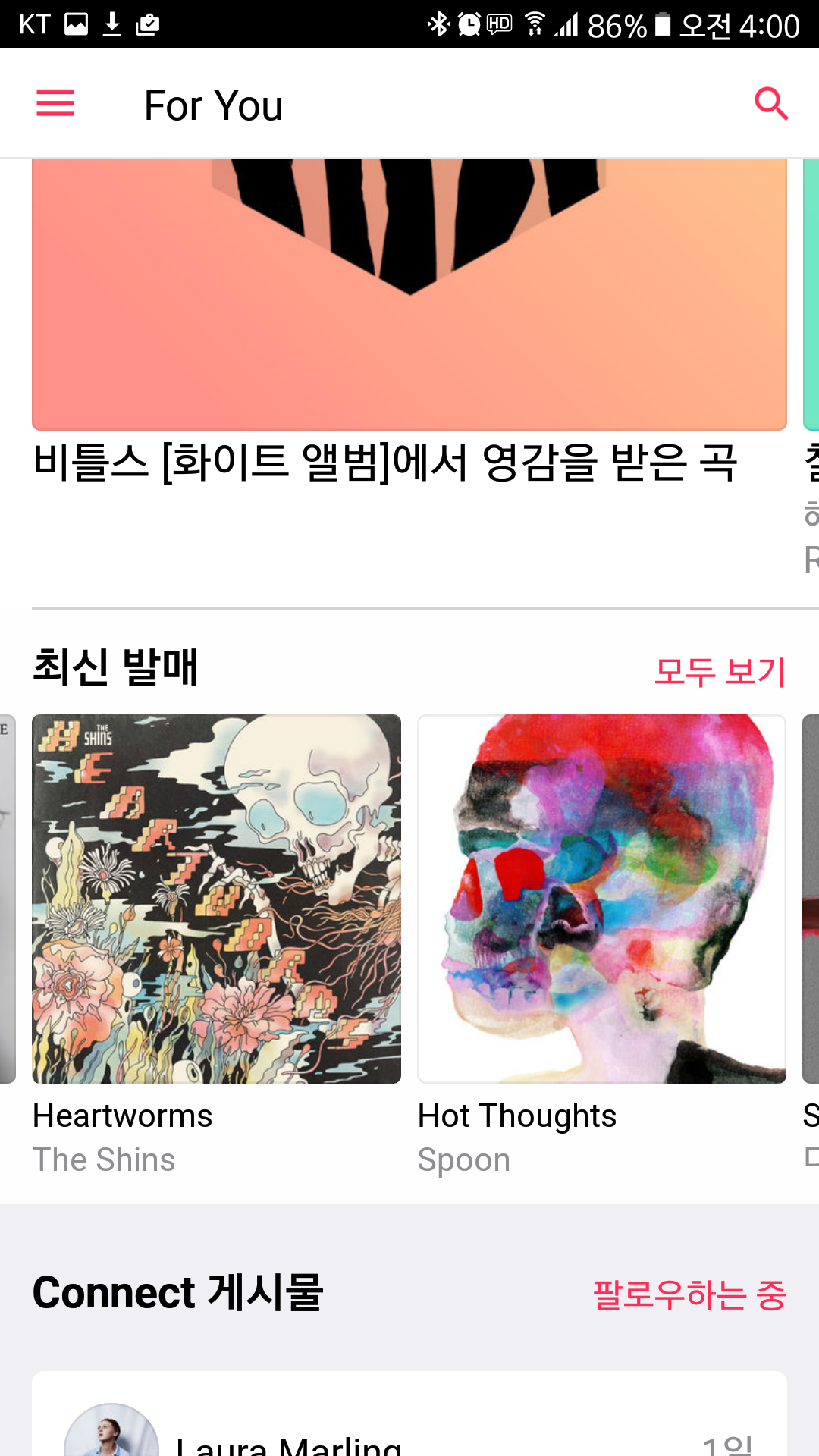 그 아래에는 내가 그동안 들었던 음악에 기반해 "OO를 좋아한다면"이라는 테마로 개별 앨범을 추천한다. 그 밑에는 아티스트 추천목록, 그 밑에는 최신 발매 앨범 등 일반적인 기능들이 등장한다. 그리고 제일 아래에는 Connect가 있다. "For You"만큼이나 무쓸모라고 생각했던 기능인데, 이걸 개별 탭이 아니라 어디에서든 노출되게 만든 건 좋은 선택 같다.