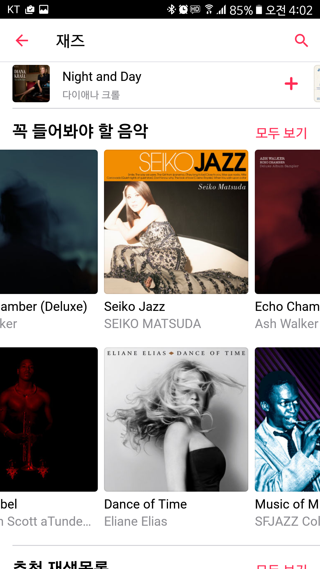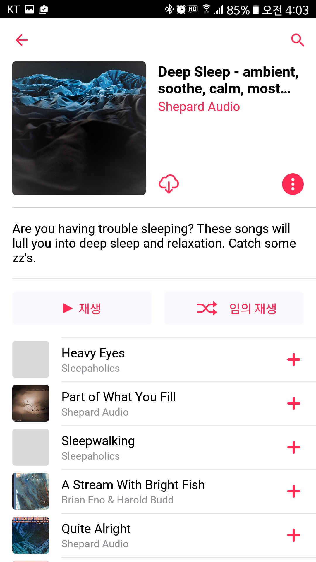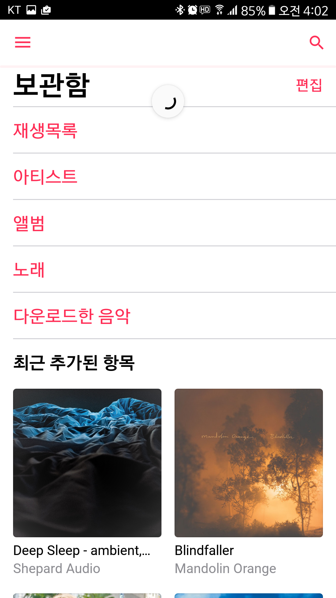 최근 추가된 항목은 앨범이든 노래든 재생목록이든 관계없다. 가장 최근에 잠 때문에 들었던 앰비언트 음악 재생목록을 추가한 게 가장 먼저 노출된다. 재생 목록 디자인도 전체적으로 빈 공간 없이 큼직하고, 재생과 임의 재생 버튼도 공간이 커졌다.