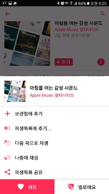 이번 업데이트에서 가장 특이한 건 바로 '별로예요'라는 메뉴가 생긴 것. 애플 뮤직에서 하트는 좋아하는 것을 표시하는 용도라고 생각했는데, 이게 좋아요/별로예요 가 되면서 일종의 grade로 바뀐 것이다. 별로예요라니 ㅋㅋ 아침부터 보면서 터졌네. 별로예요 누르면 아마 추천 목록에는 이런 스타일의 노래는 포함되지 않는다거나 할 것 같다. 별로예요 누를 음악이 많다.