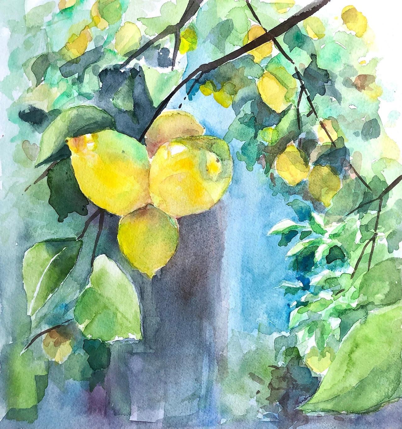 예쁜 레몬을 주으면 탁자 위에 조르르 모아 놓고 하루 이틀 향을 즐기면서 그림을 그릴 수 있다. 물론 나무에 달려 있는 레몬도 그린다. 레몬을 그리기는 쉬운 듯 어렵다. 수채화를 이제 1년 남짓 그린 실력이어서 레몬의 상큼함이 마음처럼 표현되지 않아서이다. 아주 자세하게 그리는 것보다 수채화 물감의 특성을 살려서 대충 그린 더 마음에 들긴 하다. 실은 이 레몬나무는 가지치기를 오랫동안 하지 않아서 수형이 제멋대로이기 때문에 나무 전체를 그리기는 어렵다. 지금 초록인 레몬들이 내년 봄쯤 노랗게 익으면 그때 가지치기를 하고 한두 해 지나야 나무 모양이 조금 잡힐 것 같다. 그때까지는 레몬나무 대신 레몬을 많이 그려봐야지.