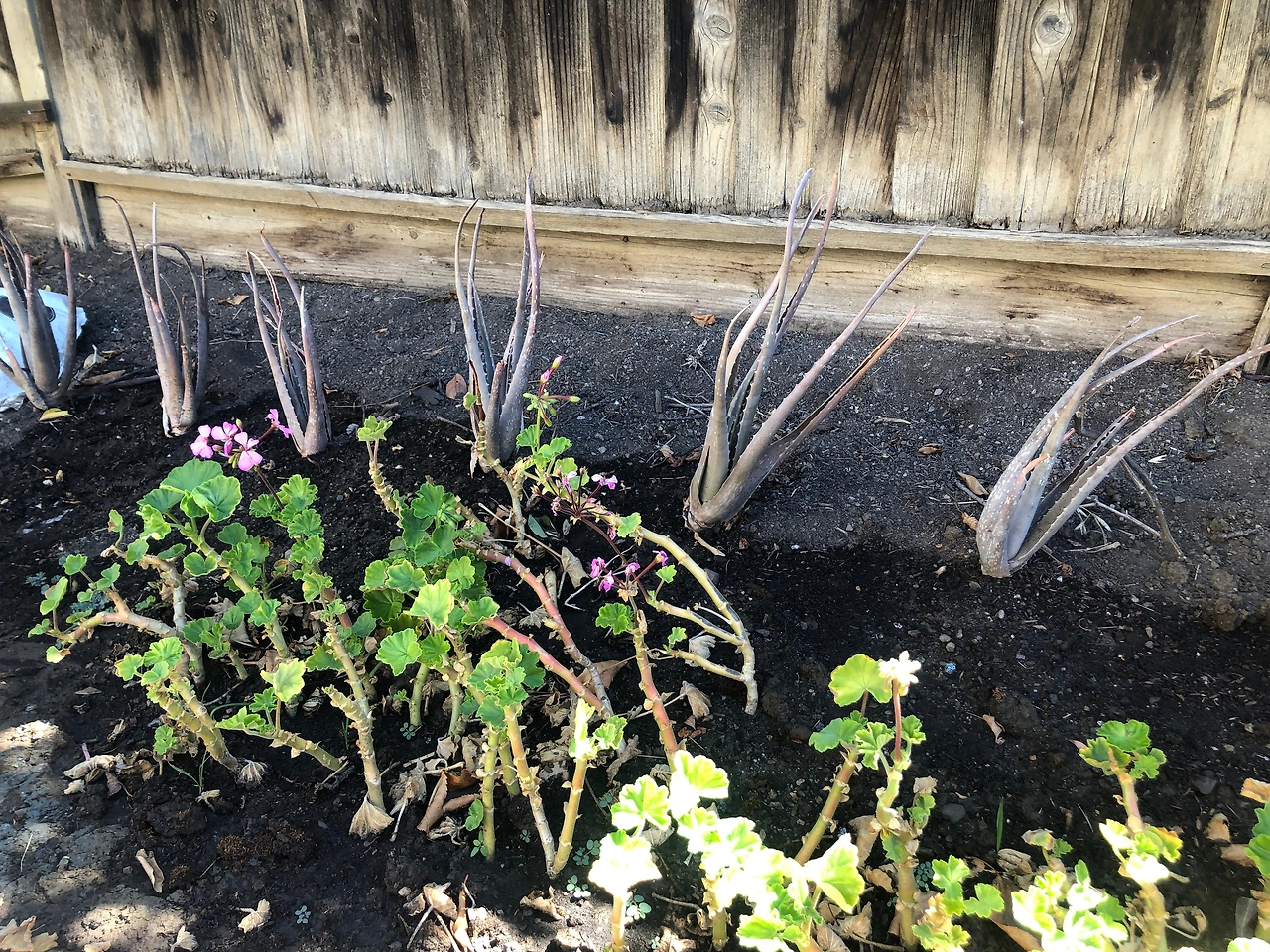 흙을 고르기 시작하면서 땅 판 것이 아까워 여기에 심었던 로즈메리와 패션 플라워는 모두 실패했다. 거름과 물을 조금씩 섞어주고 약 2개월쯤 지난 뒤 거름에서 싹튼 어린 참외와 토마토를 심었다. 핸드 블렌더의 칼날을 뚫고 살아남은 씨앗의 생명력이 대단하다. 이제 3주 정도 되었는데 화분에 심은 그루들보다 훨씬 짙고 싱싱한 잎사귀를 낸다. 하지만 동향 빛을 받는 화분에 심은 참외는 잎이 가녀려도 참외 몇 개를 달고 있는데 이 공간에 심은 참외는 초록 잎만 무성하다. 아무래도 이 공간에 채소는 기르기 어려울 것 같아서 지난주에 포기 나누기를 한 알로에와 제라늄에서 다듬어 낸 난 가지를 심었다. 꺾꽂이할 때는 꽃이 피기 전에 하는 것이 원칙인데 아직 꽃을 여기저기 달고 있는 제라늄이어서 걱정했다. 하지만 이제 일주일이 좀 지났는데 초록 잎이 제법 올라온다. 가지를 살짝 뽑아 보니 하얀 뿌리가 여기저기 보인다. 알로에도 초록빛이 돌면서 살이 오르기 시작했다. 바싹 마른 갈색 잎들이 엉겨 붙어 있었는데 알로에가 이제 숨 쉬는 게 보인다.