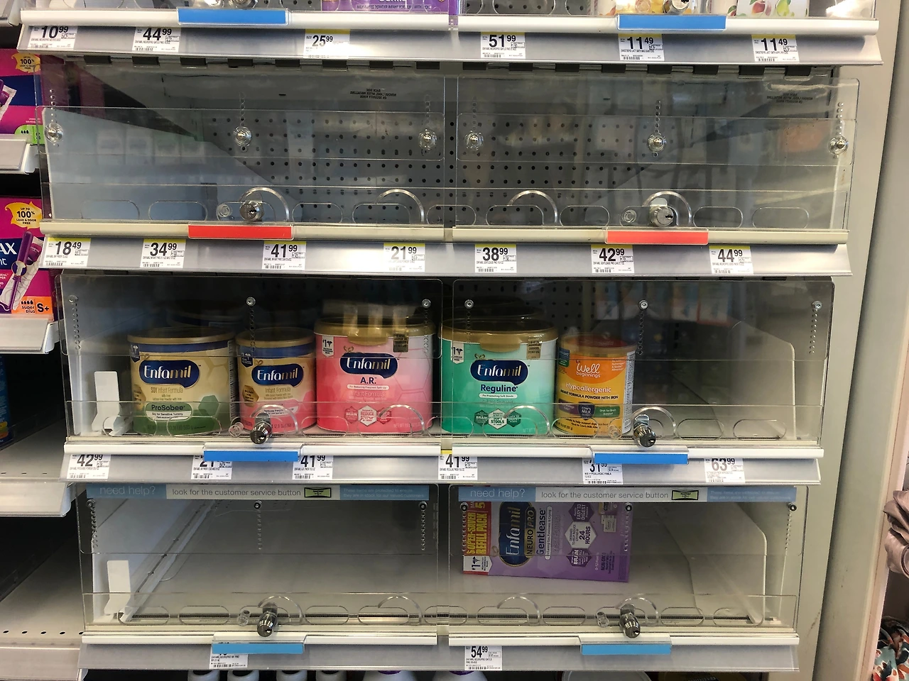 요즘 미국의 분유 문제는 심각하다. 지역사회 별로 정보를 교환하는 넥스트 도어(NextDoor.com)에는 분유를 구하기 어려워 발을 동동 구르는 부모들의 글이 가득하다. 분유를 희석해서 먹이거나 마음대로 조제해서 먹이면 안 된다는 경고 자료와 함께 분유를 구할 수 있는 출처에 대한 정보까지 오갔다. 병원에 전화해서 샘플 분유 여유분이 있는지 물어보기, 모유 은행에 연락하기, 각 분유 제조사 핫라인까지 소개되어 있다. 아래는 일주일 전쯤 집 주변의 한 약국에 갔다가 기가 막혀서 찍은 사진이다. 분유 선반이 텅텅 빈 정도가 아니라 규제 물질을 판매하도록 자물쇠가 달린 유리 캐비닛 안에 보관되어 있다. 물론 분유를 이 선반에 배정할 때만 해도 선반이 다 차있었던 듯, 세 칸 중 한 칸만 분유가 좀 남아있고 나머지 두 칸은 썰렁하다. 이곳은 시골이나 소도시가 아니라 실리콘밸리 한복판에 있는 주택가이며, 이 약국만 이런 것은 아니고 주변 모든 약국이 비슷한 상황이다.