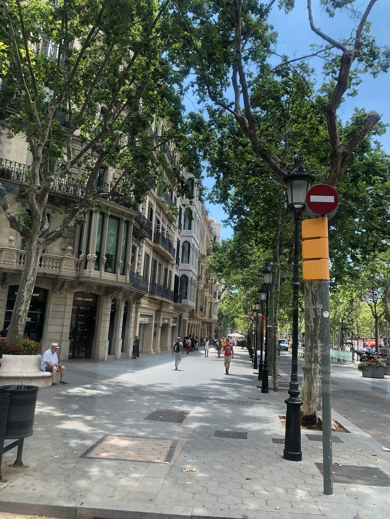 첫날 소감을 말하자면, 거의 20시간에 걸쳐 비행기를 두 번 갈아타고 캘리포니아와 시차가 9시간 나는 곳에 왔는데 풍경이 전혀 낯설지 않다는 거였다. 내가 사는 캘리포니아가 스페인 정복자들의 문화가 그대로 보존된 곳이어서 그런지 바르셀로나 구도심의 건물 외관이나 내부 장식이 몹시 눈에 익었다. 또 람블라 거리 풍경은 젊은 날 보았던 명동 거리, 남대문 거리를 다시 보는 듯했다. 다른 점이 있다면 거리 가운데 사람들이 지나다니고 야외 식탁이 놓인 거리가 형성되고 차는 양쪽에 늘어선 건물 앞의 좁은 차도로 다니는 정도였다. 음식이 품질에 비해 가격이 크게 저렴해서 기분이 좋았다. 다만 숙소 선정은 실패였다. 객실 내부는 세련되고 깨끗했으나 숙소가 위치한 라발지구는 편안하게 걸어다닐 수 있는 지역이 아니었다.