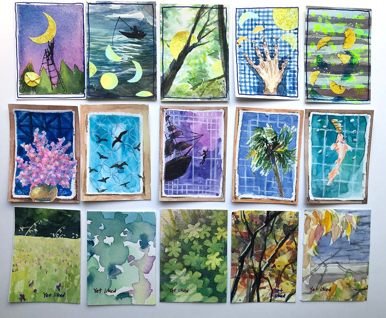 아티스트 트레이딩 카드를 제작하는 데 재료나 기법의 제한은 없다. 단 어떻게 결과물에 도달하였는지 재료와 과정을 정직하게 밝혀야 하고 크기는 정확히 지켜야 한다. 이 생소한 과제는 사진이나 실물을 보고 그리는 그림 밖으로 나가서 다양한 주제와 기법을 탐색하고 확산하는 기회가 되었다. 아래 첫 줄은 관심 있었던 "달(Moon)"을 모티브로 "달 교체하기", "달 낚시하기", "나뭇가지에 걸린 달", "손톱 깎을 때마다 자라나는 달", "조각난 달"을 탐색한 작품이고, 둘째 줄은 창살을 통해 보는 여러 사물, 풍경, 내면의 이미지를 탐색해 본 것이며, 마지막 줄은 전에 그린 수채를 그냥 트레이딩 카드 크기로 잘라낸 것이다. 내가 그린 수채화에 가위질을 하여 조각난 그림을 보자 날카로운 슬픔이 느껴져 카드 구석에 "Yet Liked"라는 말을 적어 보았다. 지금은 보관하고 싶은 그림으로 선택 받지 못하여 잘려나갔지만 언젠가는 이 잘려나간 그림들이 사랑받는 그림의 모티브가 되라는 소망을 담은 작은 애정표시였다.