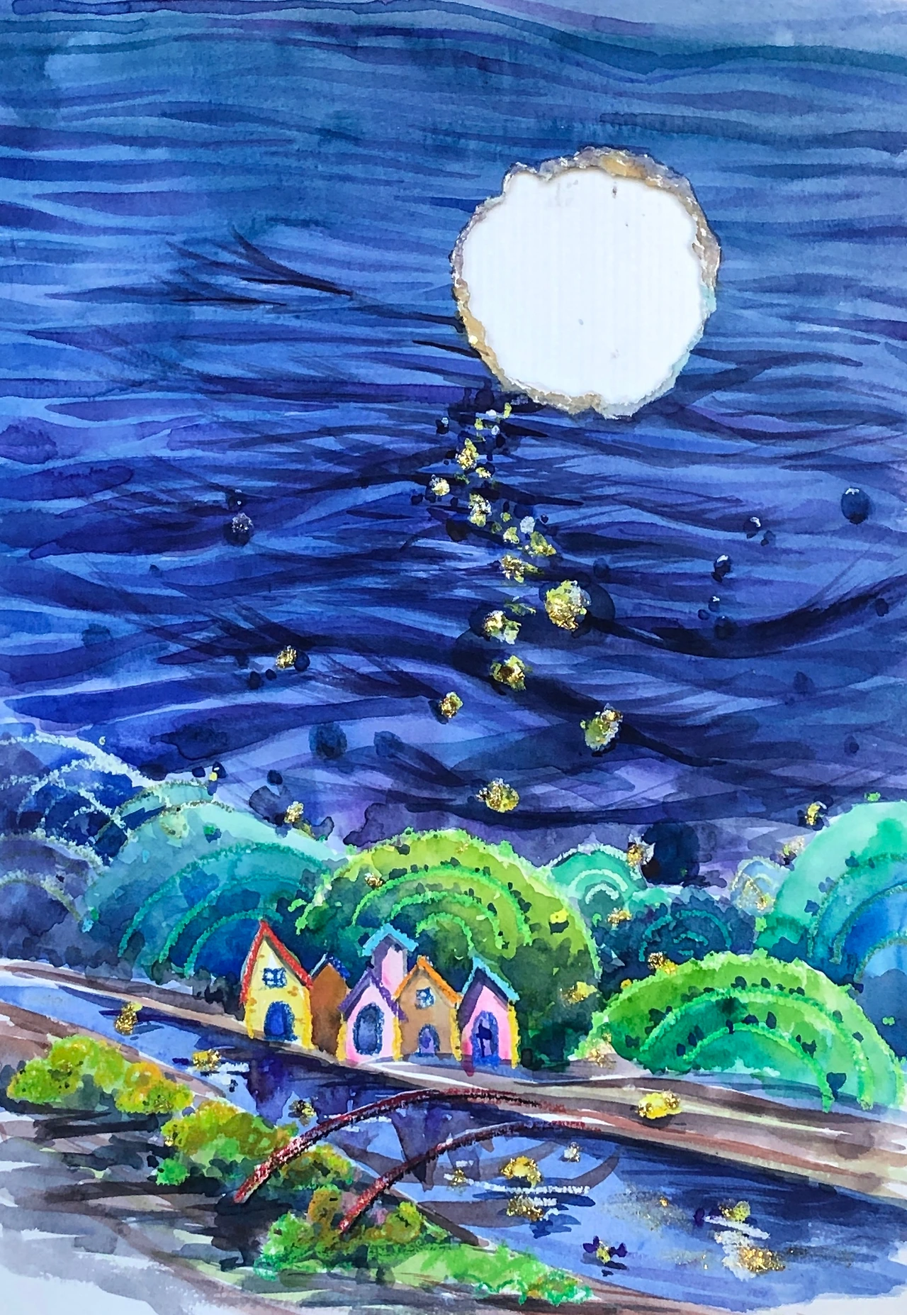 14x17인치(약 35x43cm) 브리스톨 종이에 크레파스와 수채화를 주 미디엄으로 하여 그렸다. 여전히 아름다움이 존재하는 동화같은 세상을 표현하기 위한 것이다. 잃어버린 달은 종이를 뜯어내어 표현했다. 즉, 종이에는 실제로 구멍이 있어서 그 뒤에 오는 것을 그대로 보여준다. 저 구멍 뒤에는 내가 그림을 그릴 때 대고 그리는 하얀 판자가 보인다. 구멍이 얼마나 확실한 현실인가에 대한 나의 인정이며 저 구멍 뒤에 무엇이나 올 수 있다는 사실에 대한 나의 아찔한 인식이다. 끝으로 부서진 달은 매니큐어 위에 뿌리는 반짝이로 칠했다. 그 어떤 소재, 그 어떤 색 위에서도 반짝이도록 하고 싶었다.