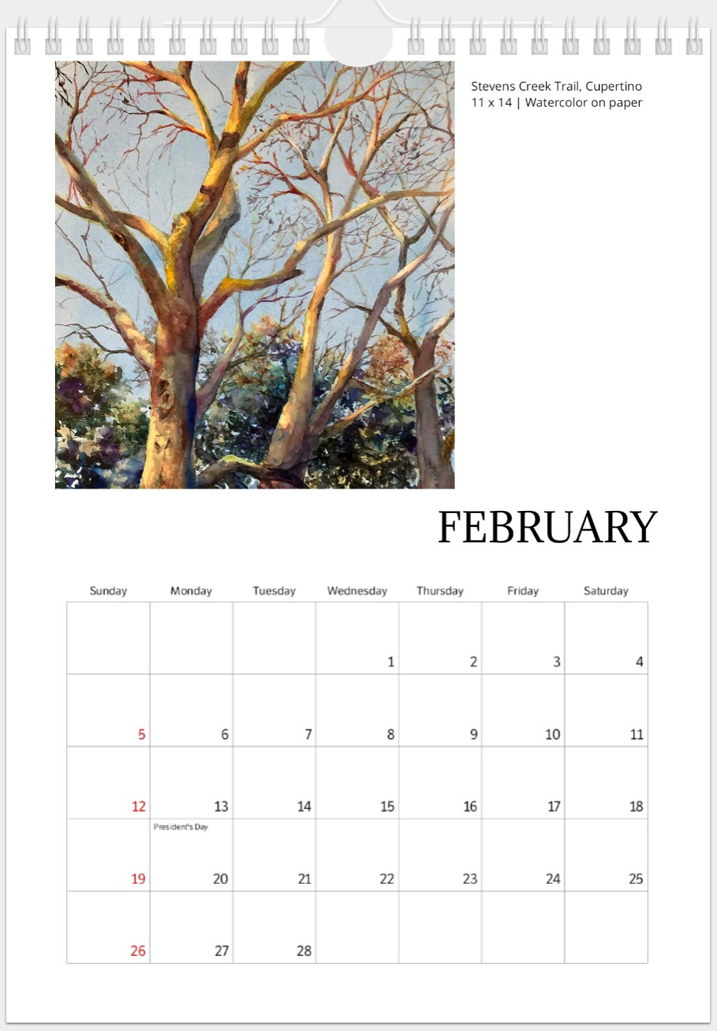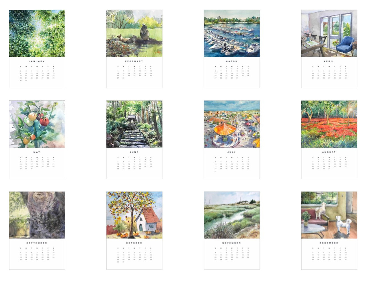 2022년에 그린 수채화 중에서 열두 달과 표지에 들어갈 그림까지 총 열세 장을 골라서 달력을 만들었다. 산호세나 샌디에이고 지역 그림만 모을까, 펜화만 모을까, 스페인 여행 그림만 모을까 고민하다가 정물화, 아크릴 화, 드로잉 등을 모두 제외하고 지역 관계없이 풍경화에 속하는 수채화(펜 사용 포함)만 넣었다. A4 가량 크기의 벽걸이 달력으로 날짜에 메모할 수 있는 공간이 크고 그림은 그 위에 작게 들어간다. 그림 제목과 크기 정보다 작은 글씨로 넣었다.