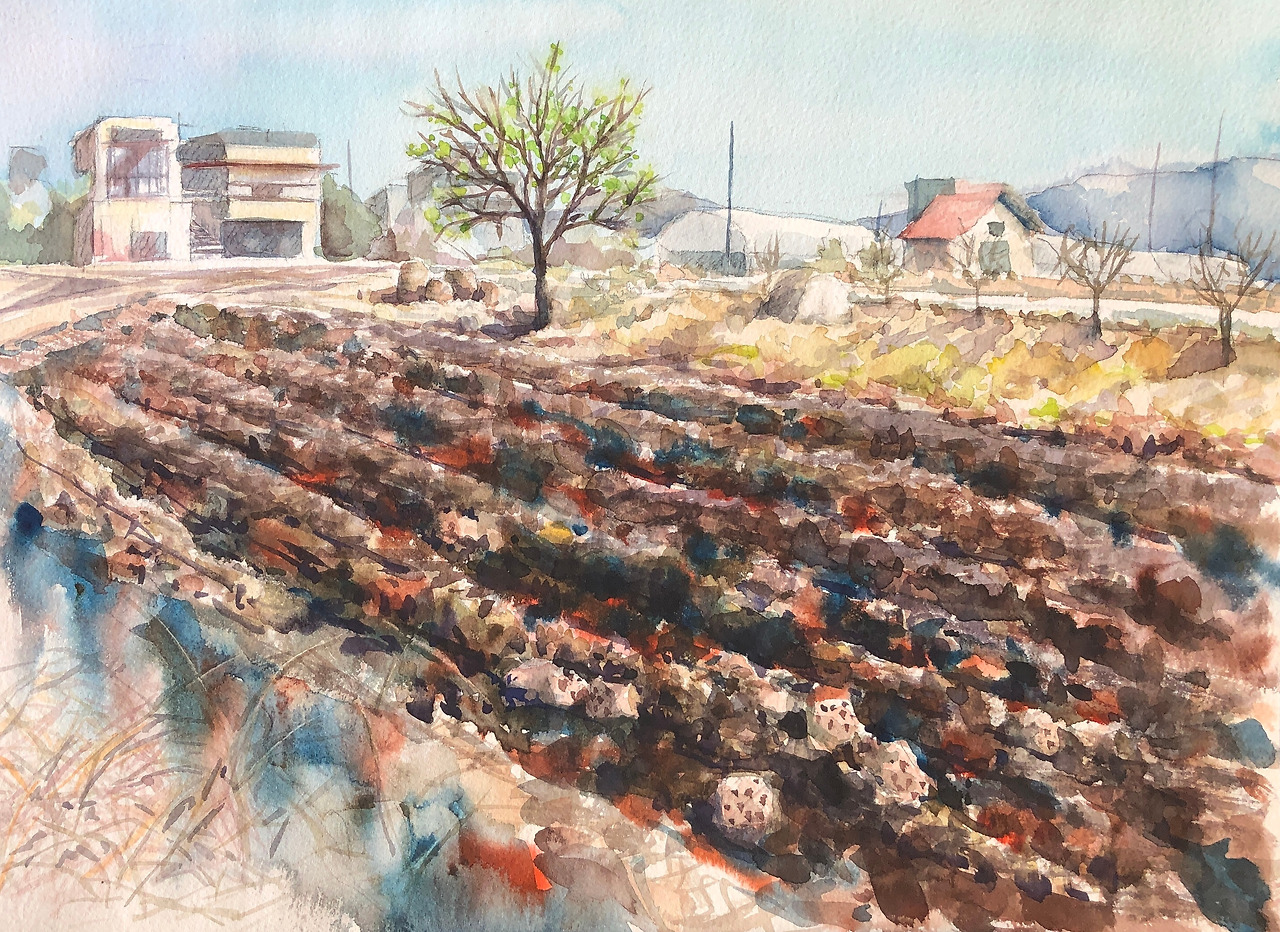 왼쪽 아래: 올 3월의 양수리. 연탄재를 잔뜩 뿌리고 엎어놓은 밭과 물이 오르기 시작하는 나뭇가지가 인상적이어서 그려보았다.