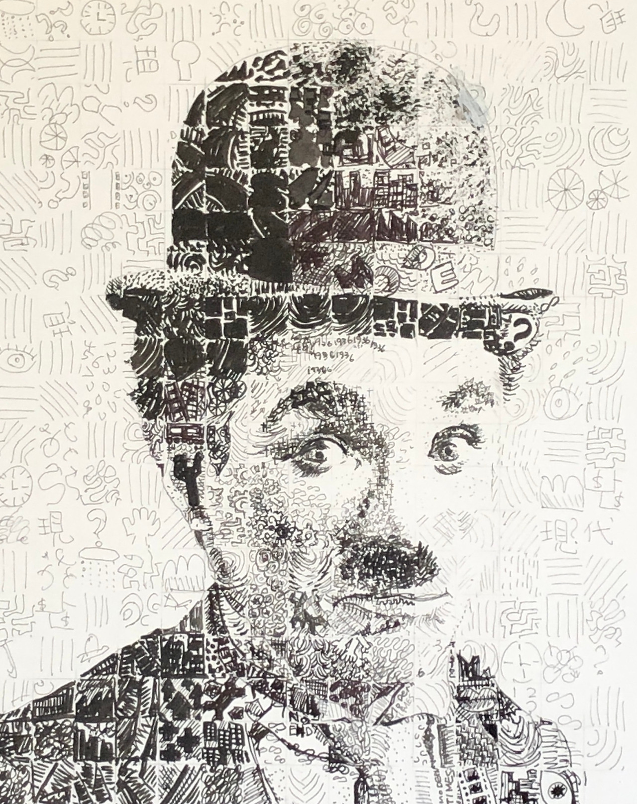 왼쪽 위: 드로잉 수업 시간에 인벤티브 텍스처(Inventive Texture) 연습으로 그린 찰리 채플린이다.