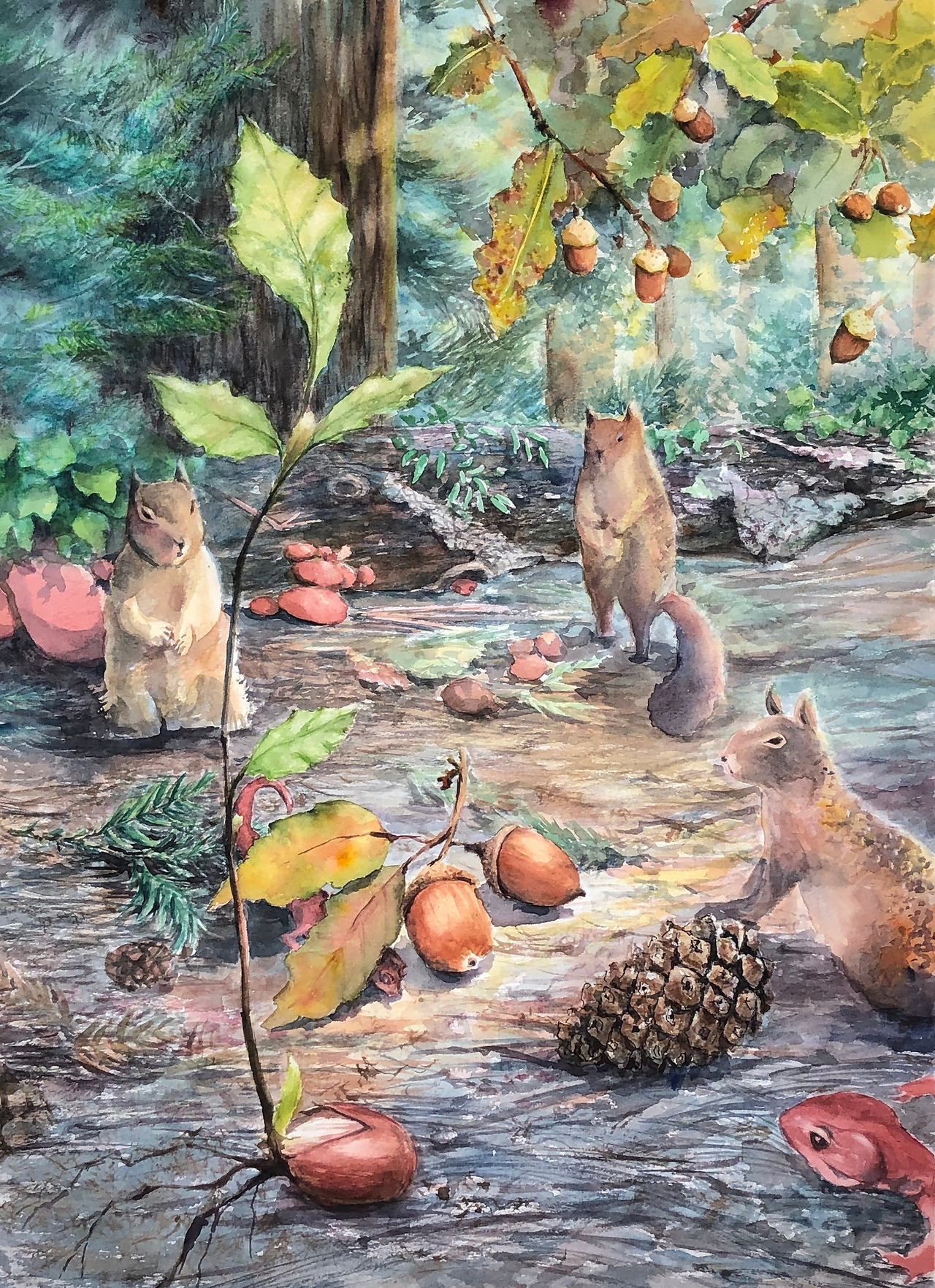 수채 물감으로 세밀화를 그려보았다. 자연을 소재로 정하고 나자 자주 걷는 스티븐스 크릭 트레일이 떠올랐다. 그동안 찍은 사진을 넘기면서 아이디어를 모았다. 저장 및 검색 기능이 부실한 머릿속 대신 컴퓨터가 있어서 얼마나 고마운지. 바닥에 수북이 쌓인 각종 낙엽, 거대한 삼나무 숲, 바닥에 쓰러져서 또 하나의 생태 공간으로 태어난 나무, 한 마리가 머리를 내밀면 다른 구멍에서도 머리를 쏙쏙 내미는 땅다람쥐들, 언젠가 딸이 도로에서 수풀로 옮겨주었던 아기 도룡뇽 등등이 눈에 들어왔다. 그리고 사람의 눈을 피해 야생 생물들의 잔치가 벌어질 것 같은 공간이 떠올랐다. 먼저 주요 등장 인물을 캐스팅하여 도화지 위에 배치한 뒤 머릿속에 있던 공간을 완성해갔다. 등장 인물을 배치하면서 이야기가 자꾸 생겨났다.