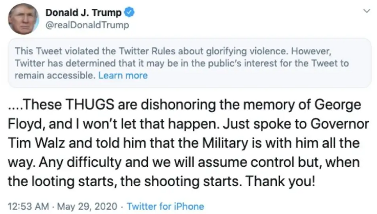 트위터는 트럼프의 트윗이 폭력 찬미를 금지하는 트위터 규정에 반한다고 지적했지만 막지는 않았다. 트럼프의 트윗과 경찰의 대처는 불과 몇 주전 외출금지명령에 항의하는 트럼프 지지자들이 온갖 총으로 중무장하고 미시간 주지사 관저 앞에서 시위를 벌였을 때와 극명한 대비를 이룬다. 당시 트럼프는 "그들은(무장한 사위대는) 좋은 사람들인데 그냥 화난 것뿐이야"라며 시위대를 옹호하는 트윗을 날렸고, 경찰은 시위대를 보호하기에 급급했다. 그 시위대는 모두 백인 극우주의자들이었다.